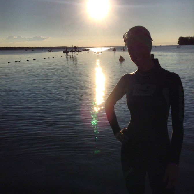 I get thee to water! The sunrise was breathtaking. All the other participants were hanging out in T1, with their tri clubs, or racing friends. Me? I was down at the beach watching the sunrise…