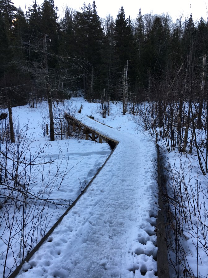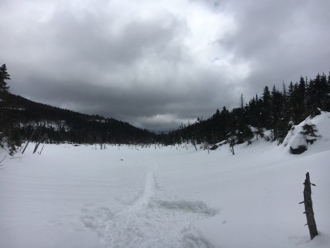 For the next 1.7 miles, the terrain transformed once again. We hiked in and out of tall, balsam pines and open vastness, as we approached the infamous bog area. I told Mallory how this part of the trail was deemed impassable due to the floating bogs being completely submerged. Lucky for us, the flooded bog rested under layers of ice and an immense amount of snow!