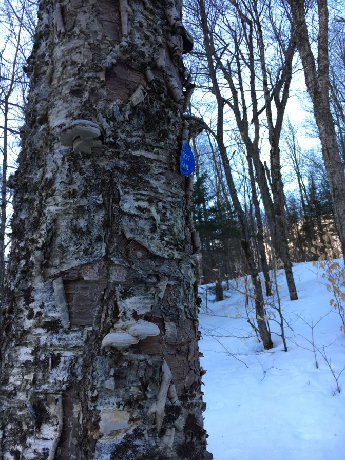 Still adorned by sunshine (for now), we stopped for another refueling break for 15 minutes. It felt heavenly to plop ourselves down in a snow bank and rest the snowshoe toes for a bit. A review of the plan was necessary too. Next up would be the serious loss of elevation as we dropped down into the valley of the Feldspar trail, following blue trail markers still…
