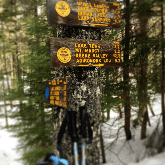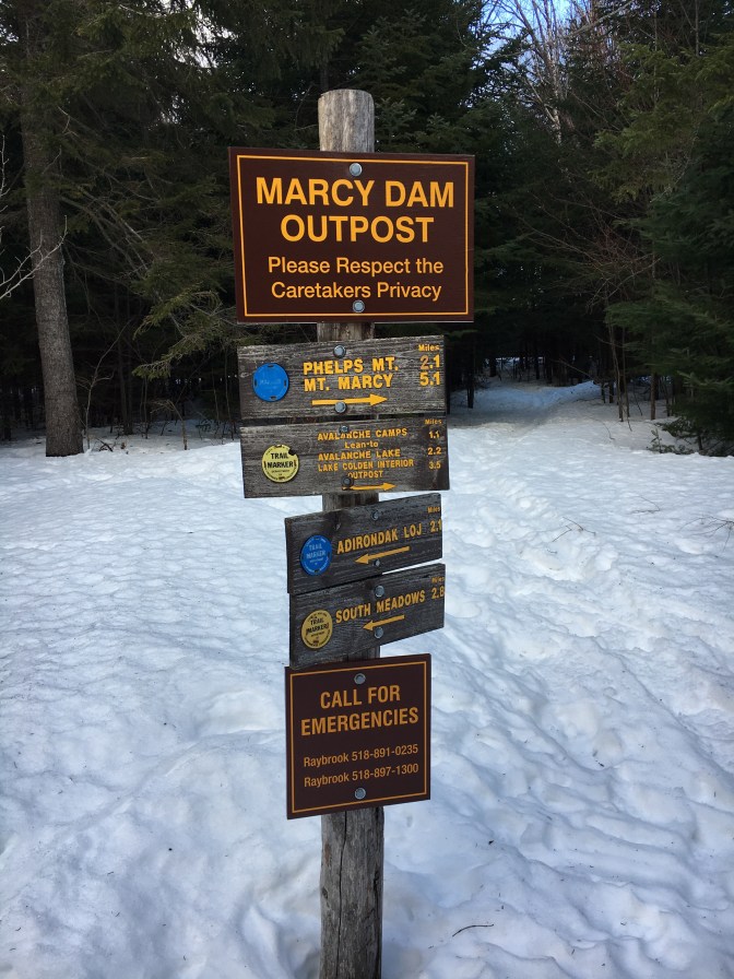 At 8:50 a.m., we approached our next signage of many junction points on this high peak trek. Back to the blue trail markers as we began the ever-steady climb up to Lake Arnold. Lake Arnold…sudden flashbacks to the “up and over boulder climbing” on this trail came rushing back to me from my Colden hike. We were thankful for the snow-covered path to help ease the journey. Even more thankful that the trail was still clearly laid out before us! So the next 1.5 miles would be just a couple of girls and Arnold…