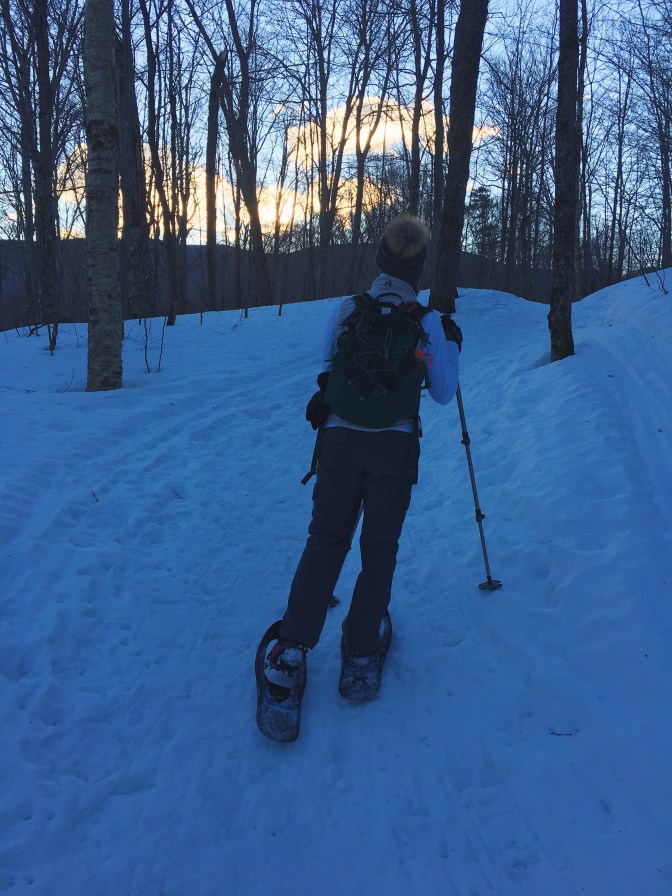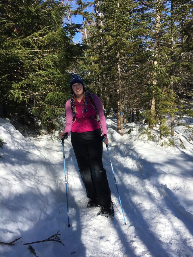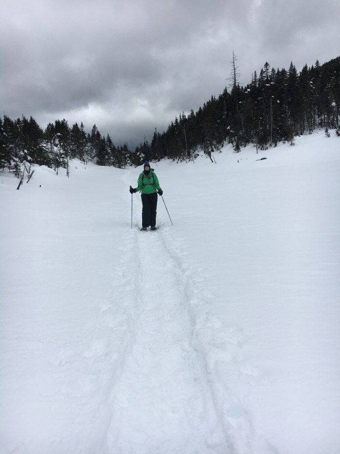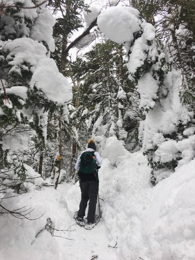 Following our groggy morning oatmeal and coffee, it was off to the Loj. We arrived at the trail head at 6:45 a.m., strapping on the snowshoes right from the get go. The weather was ridiculously warm for February…34 degrees!