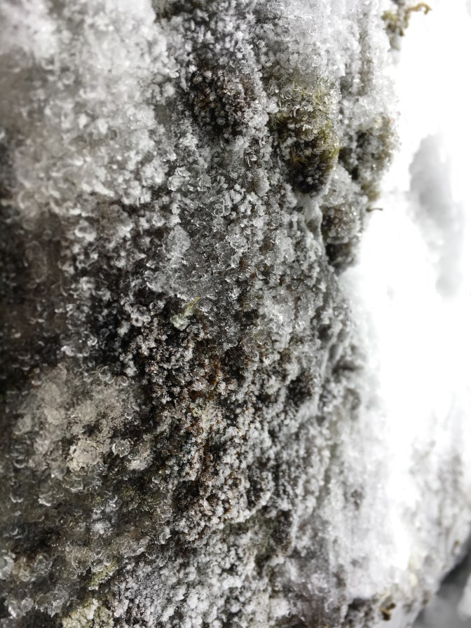 The trail was alive with wonder. Ice crystals encapsulated rock moss, it was difficult to tell where one ended and the other began. I am fairly sure, that if Mallory and I had seen a single other hiker at this point (which we had not) they would give us the curious stare…our faces were inches away from nature’s gifts, our noses almost touched the rock. I mean, because honestly, we really weren’t in any sort of rush. Well aware we would be hiking out in the dark, our biggest worry was if I pulled another “scaredy cat” move like our last hike out in spooky darkness.
