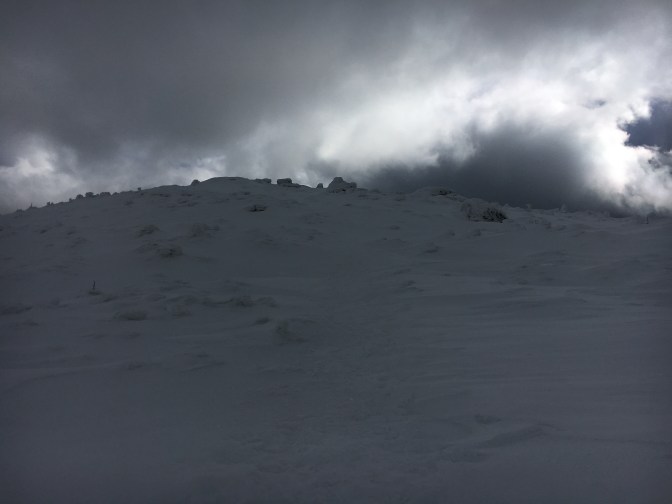 As we began our .5 mile climb, the clouds decided they weren’t quite ominous and life-threatening enough for a couple of girls fighting through the increasing wind and piling snow. A more dramatic summit was apparently called for!