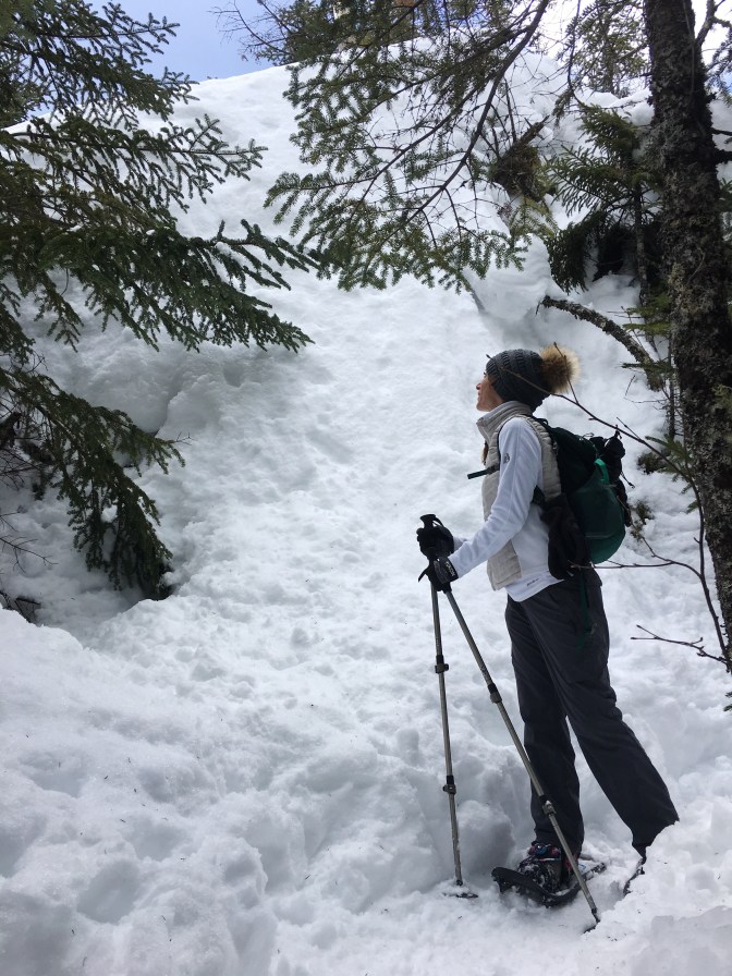 Whoa…huge wall of snow. Continually astonished by just how much snow was out there in the high peaks, we trekked on through more towering pines.