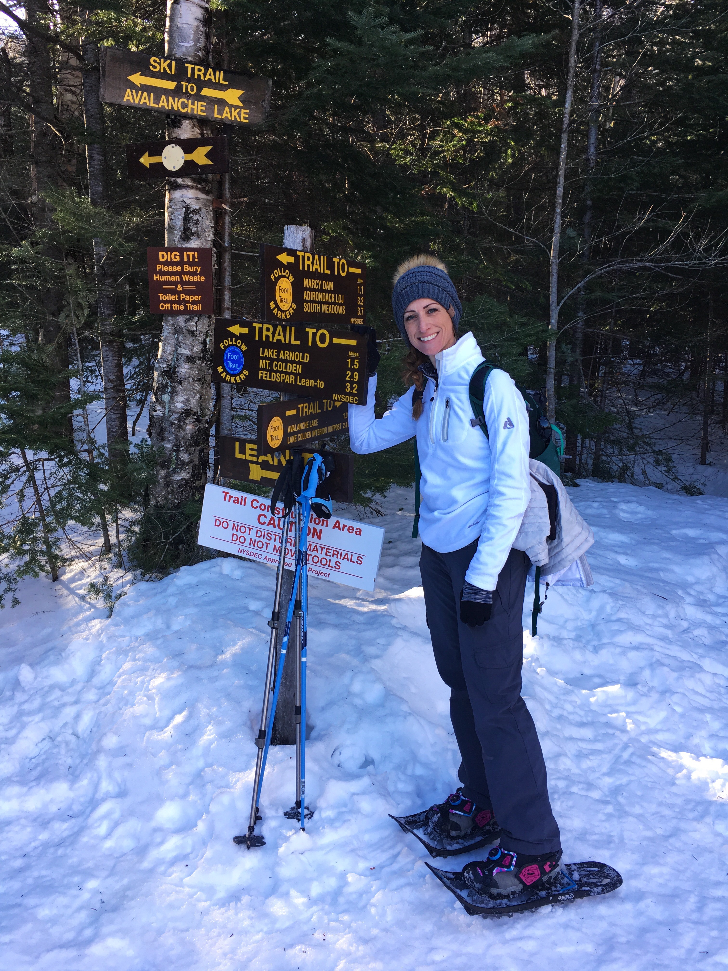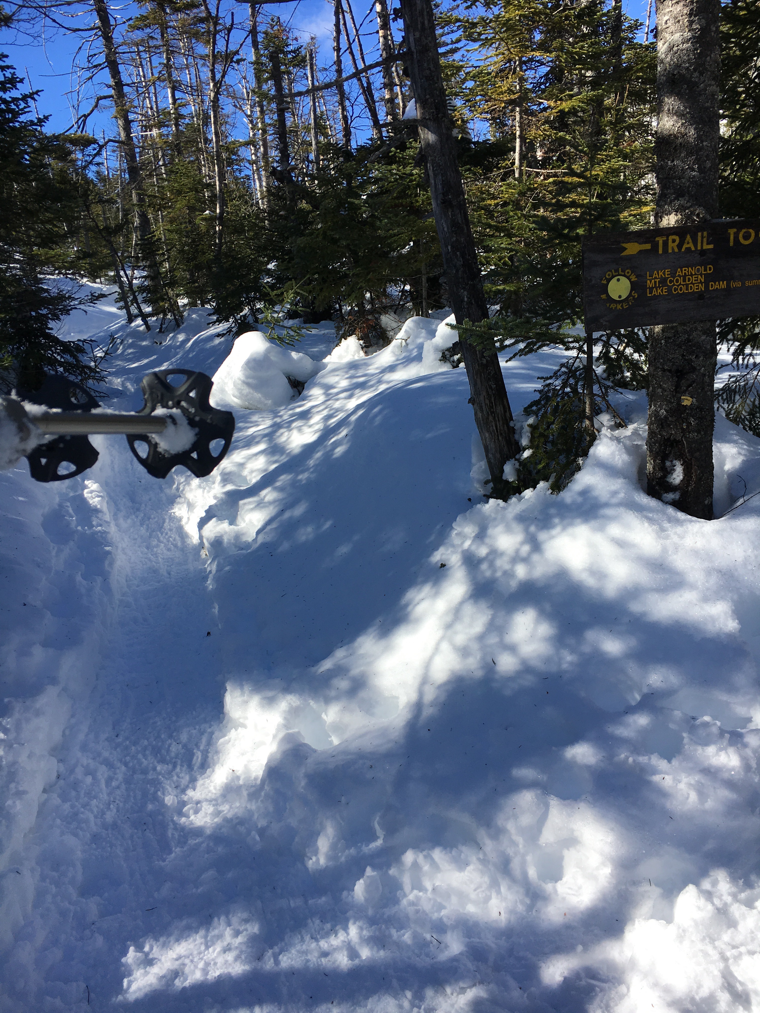 At 8:50 a.m., we approached our next signage of many junction points on this high peak trek. Back to the blue trail markers as we began the ever-steady climb up to Lake Arnold. Lake Arnold…sudden flashbacks to the “up and over boulder climbing” on this trail came rushing back to me from my Colden hike. We were thankful for the snow-covered path to help ease the journey. Even more thankful that the trail was still clearly laid out before us! So the next 1.5 miles would be just a couple of girls and Arnold…