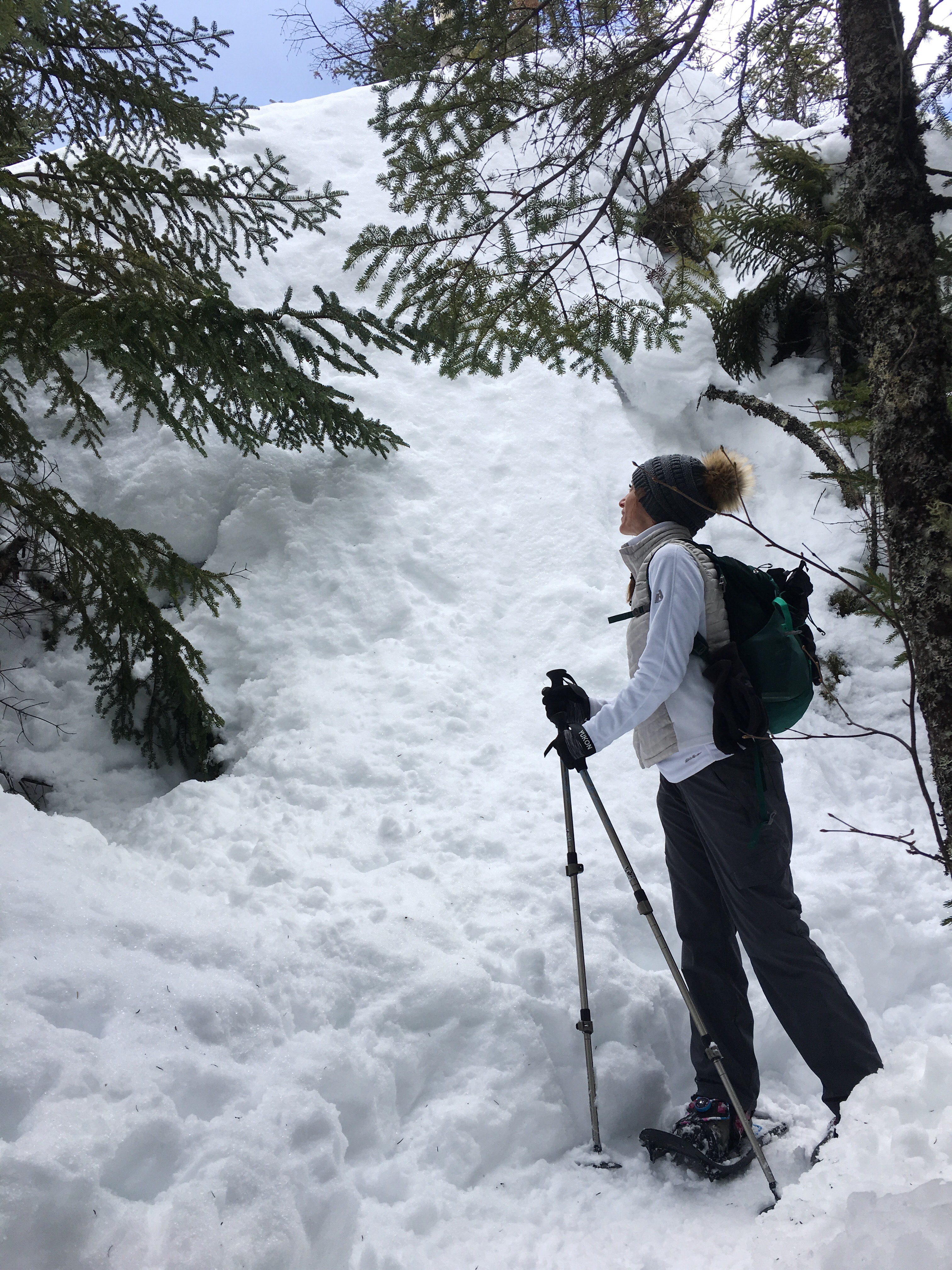 Following our groggy morning oatmeal and coffee, it was off to the Loj. We arrived at the trail head at 6:45 a.m., strapping on the snowshoes right from the get go. The weather was ridiculously warm for February…34 degrees!