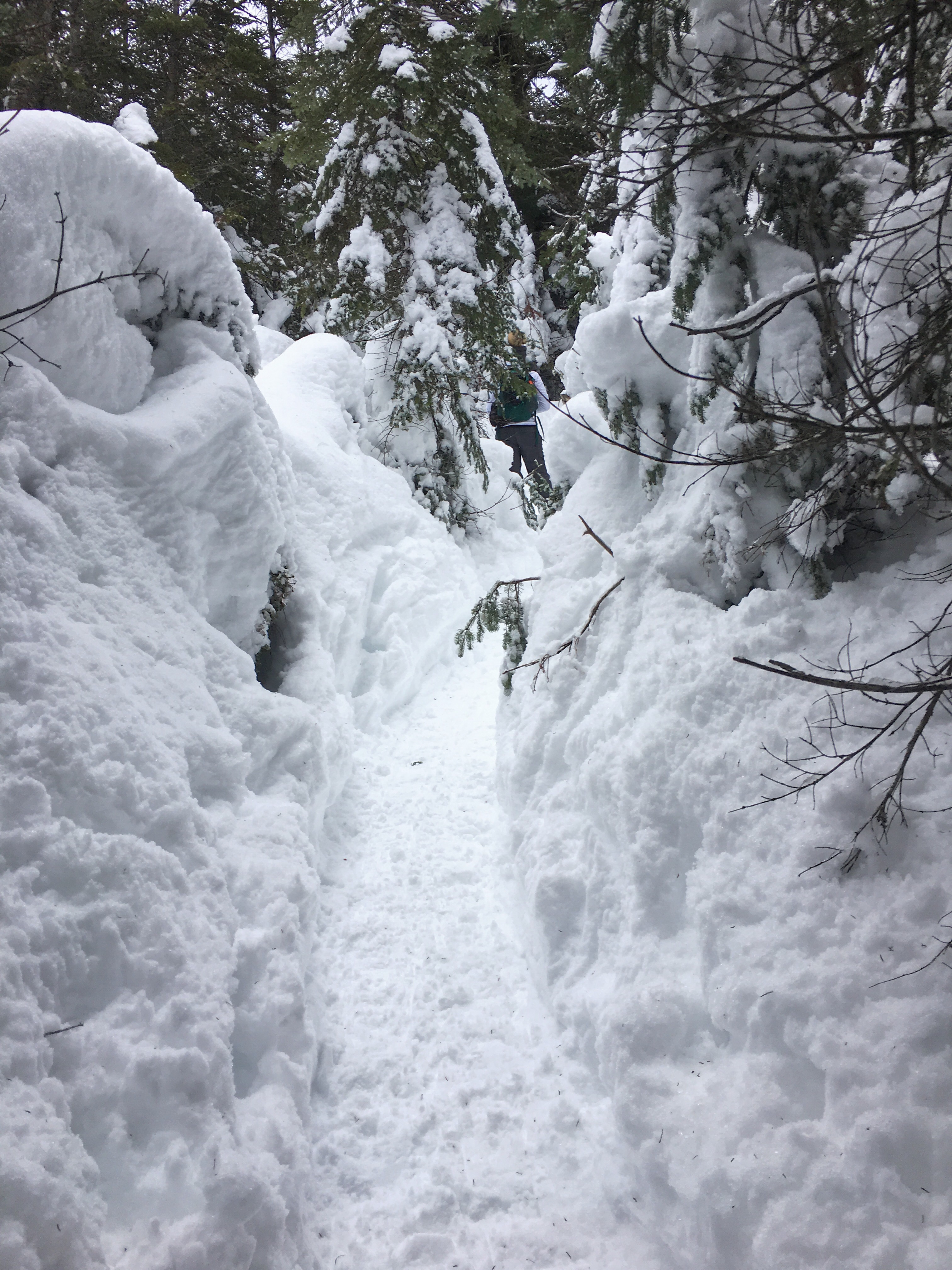 Whoa…huge wall of snow. Continually astonished by just how much snow was out there in the high peaks, we trekked on through more towering pines.
