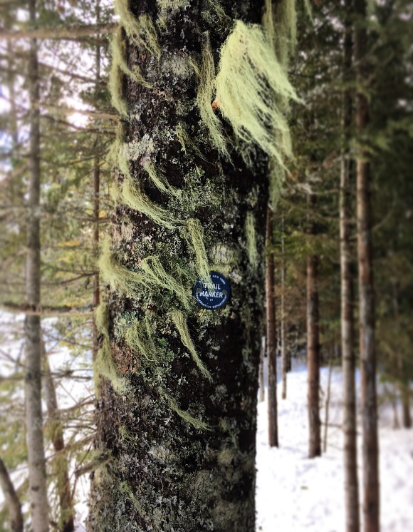 Still adorned by sunshine (for now), we stopped for another refueling break for 15 minutes. It felt heavenly to plop ourselves down in a snow bank and rest the snowshoe toes for a bit. A review of the plan was necessary too. Next up would be the serious loss of elevation as we dropped down into the valley of the Feldspar trail, following blue trail markers still…