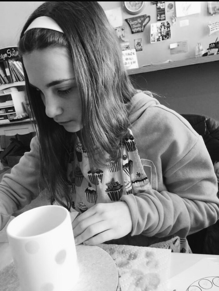 The concept was inspired by my oldest daughter, who has a particular keen eye for color. One day years ago, when we were painting pottery together at the local village shop, she was meticulously and thoughtfully choosing her paint hues, as she often did. Nina is the essence of “take your time and wait until it is right.” God bless her.