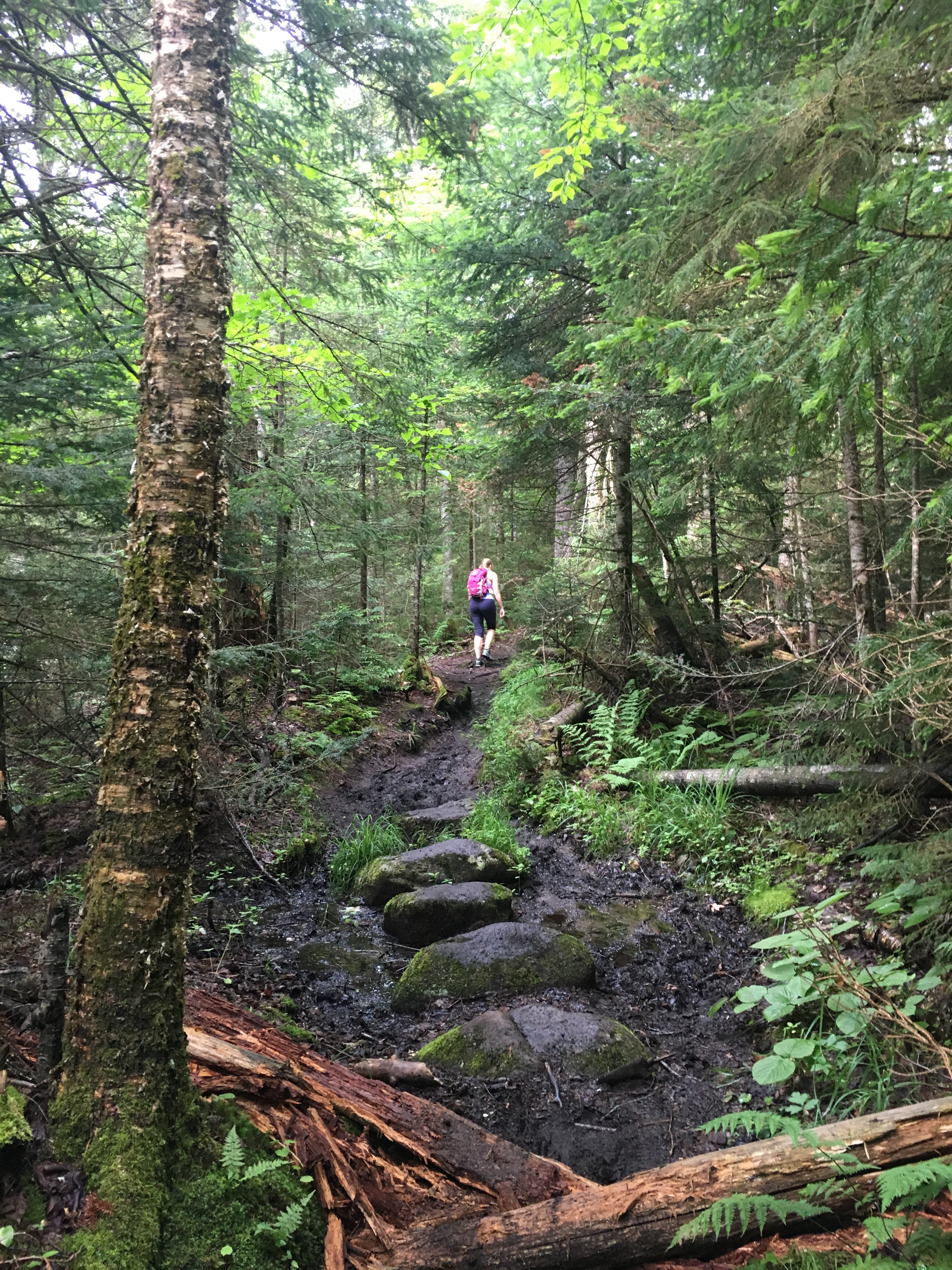 On Sunday morning, we headed out on the Phelps trail at 8 a.m., right after breakfast. It was a 1.5 mile hike to Bushnell Falls, where our next junction point was located. Aside from the mud, the beginning of the hike was quite lovely. The trail weaved along gradually with ease. From the JBL, the total mileage was predicted to be about 12 miles.