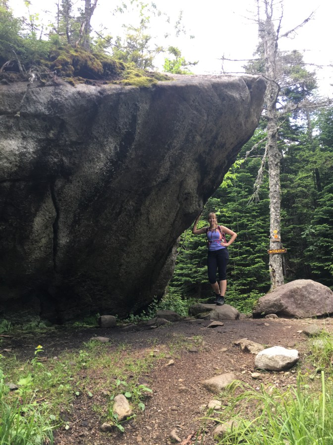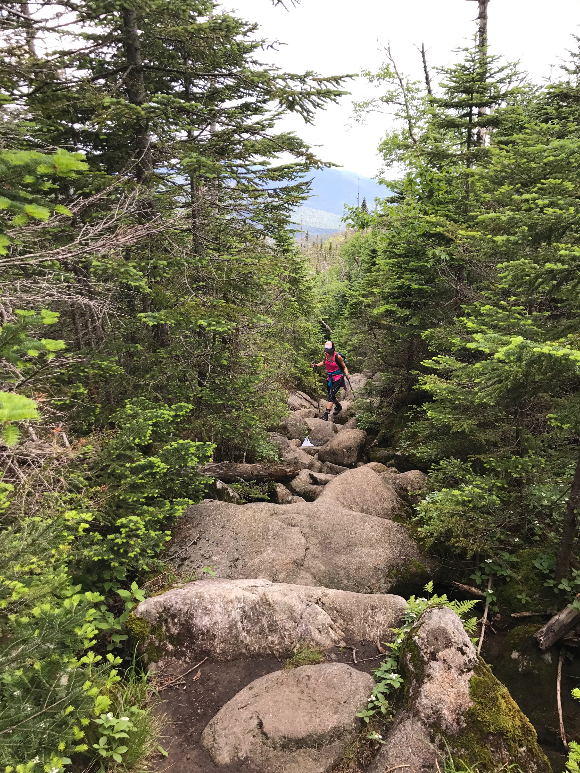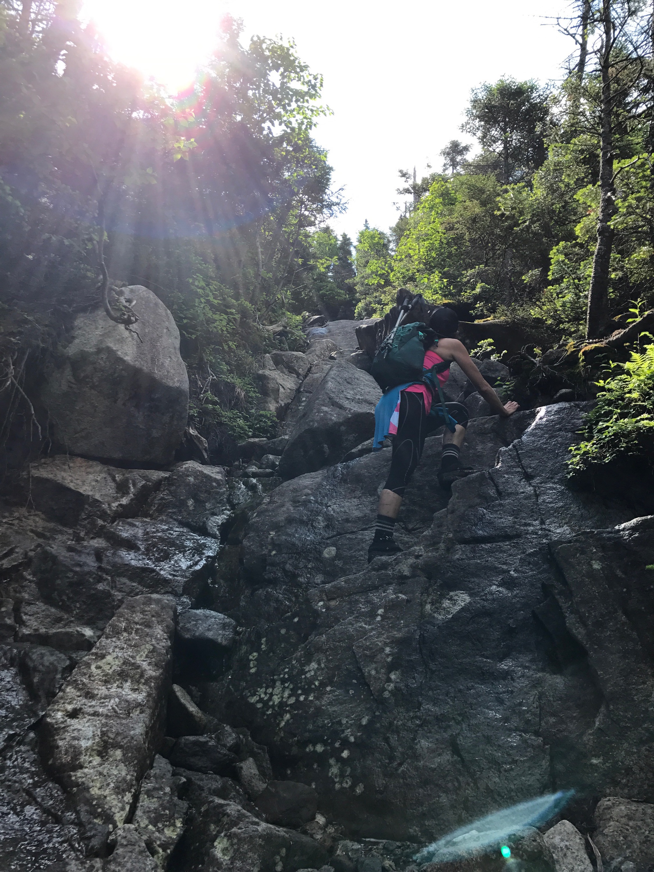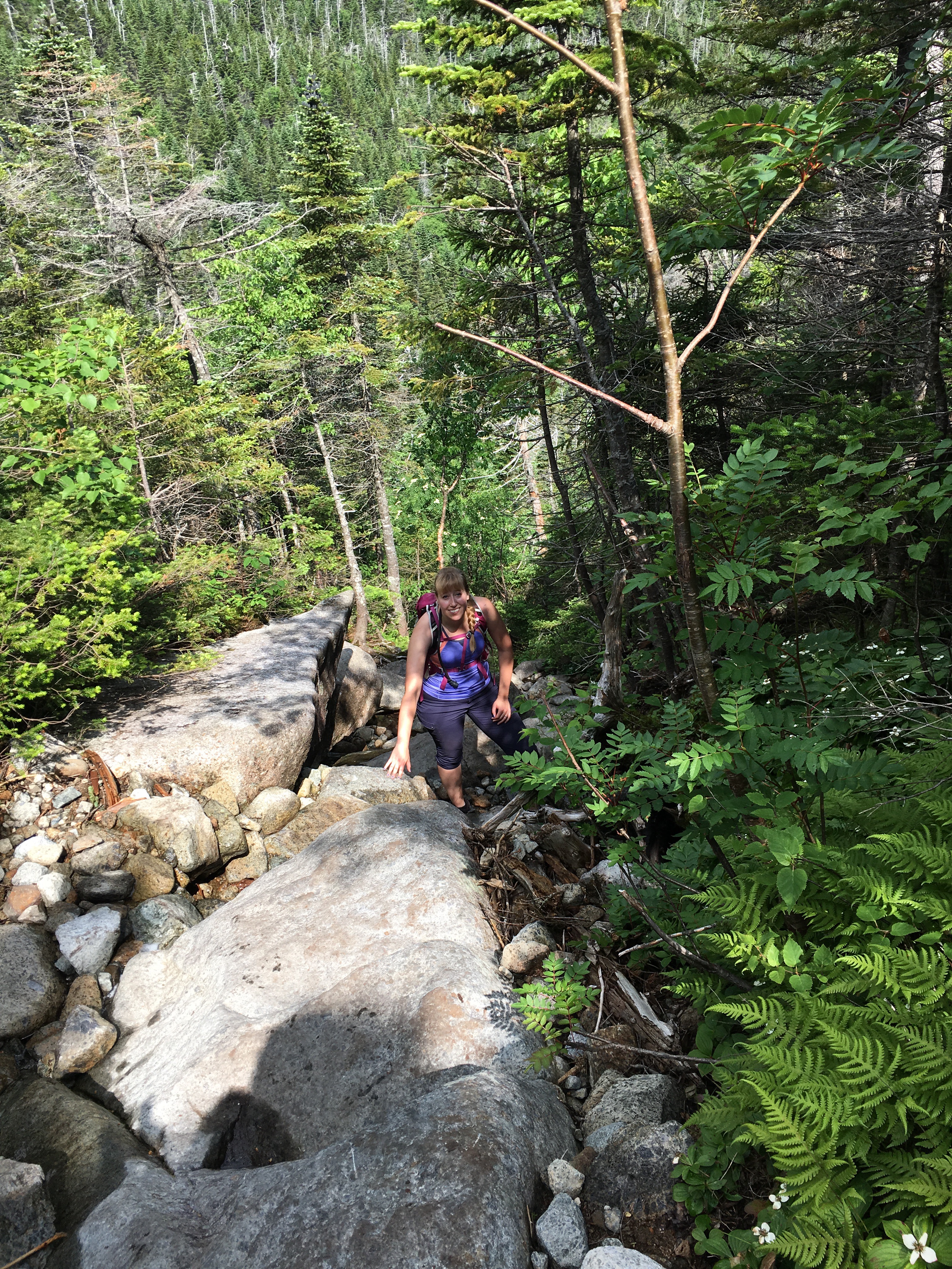 Now…descending Little Haystack was a different story. At first glance, he seemed to drop straight down. I shook my head, like “no way not going..” I couldn’t see the footholds and ledges from where I was standing…slightly disconcerting! But, just take one yellow blaze at a time and hike the moment you are in. I had to do a few of my “turn around and climb down backwards” moves, but I did it!