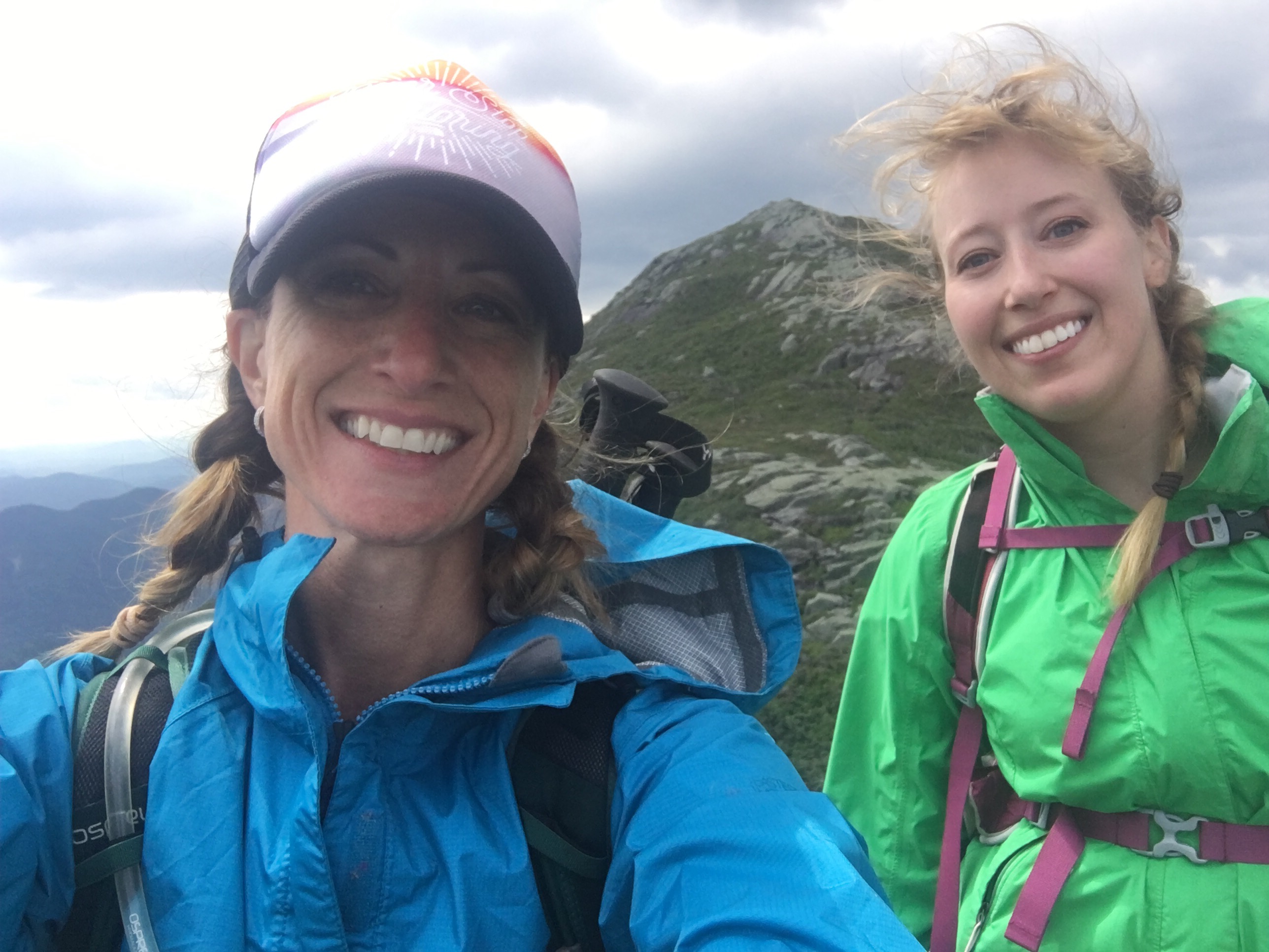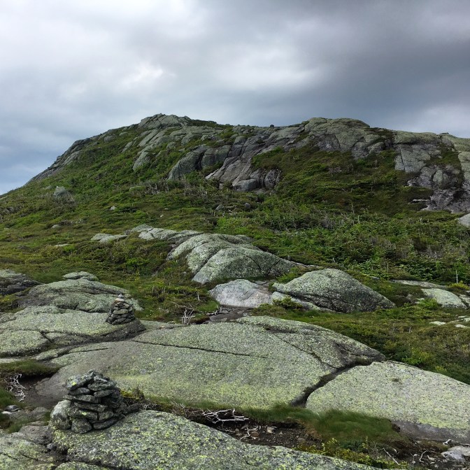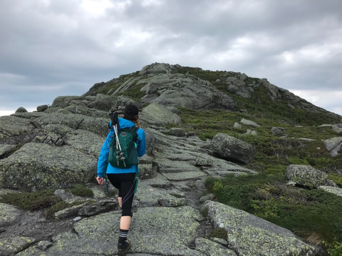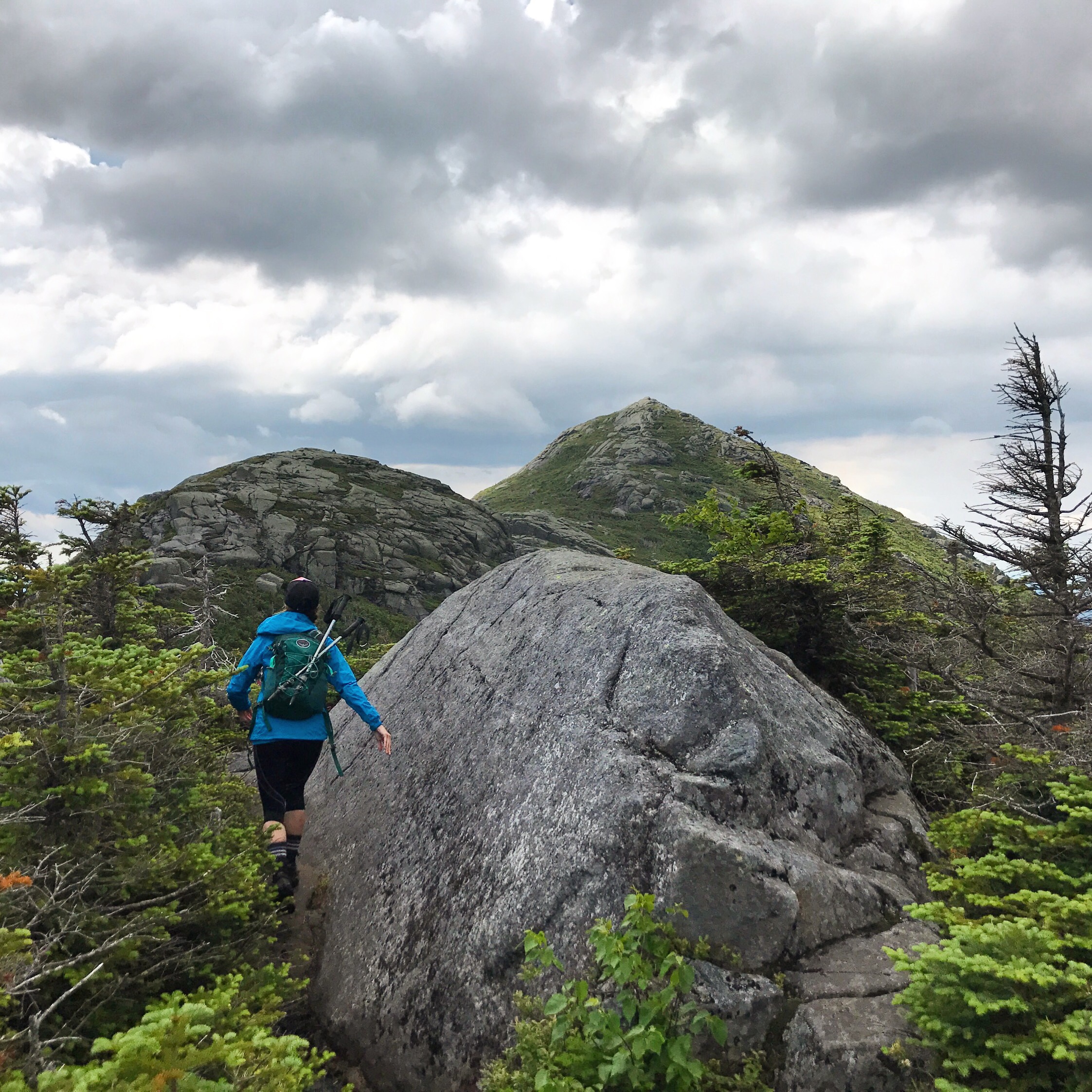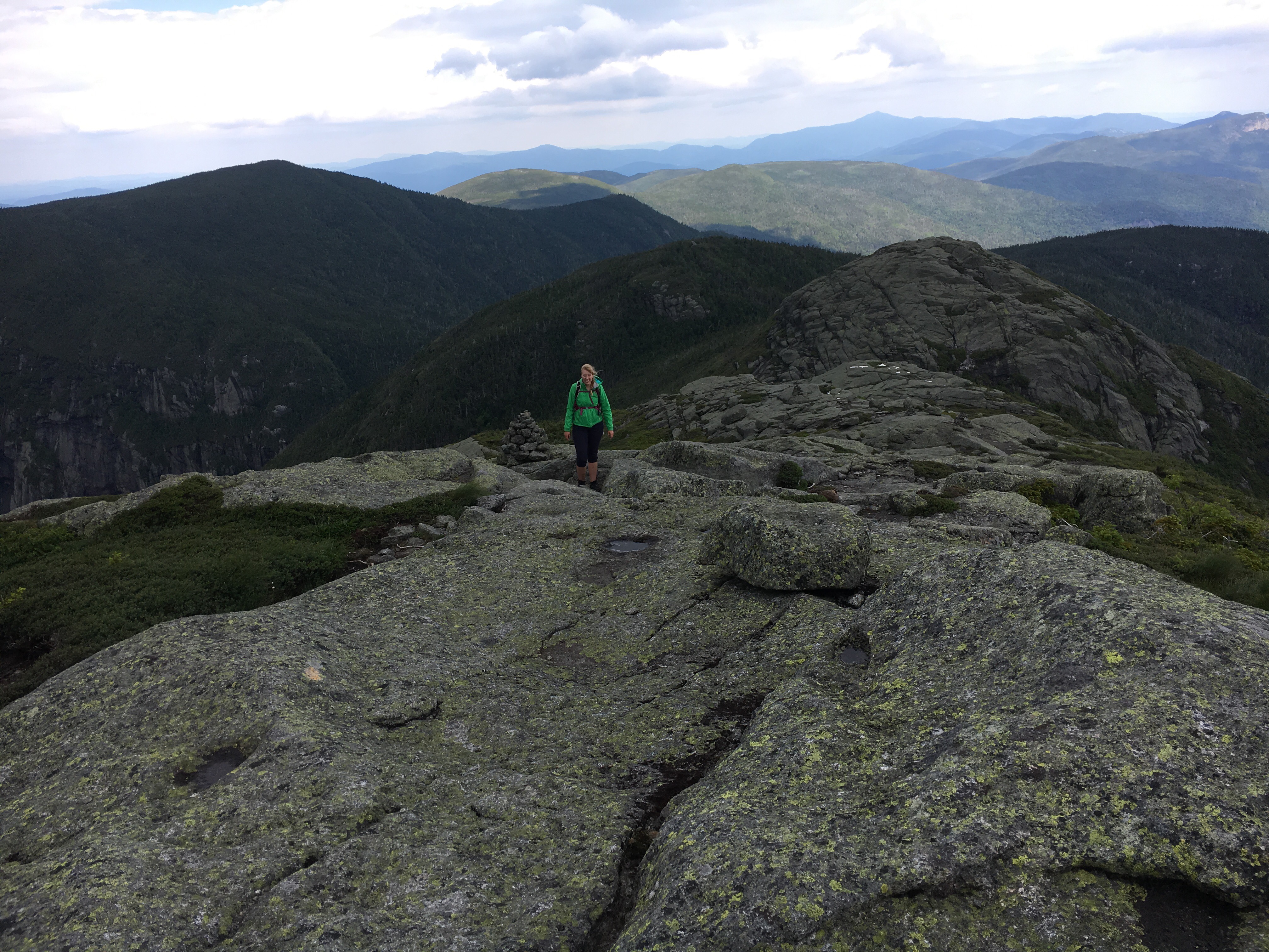 After our 10 minute refueling, the excitement began to build as we left the nub and marched our way over to Little Haystack. Ok…Little Haystack. The views from the summit were incredible! Ascending was relatively simple, following the cairns and the right angle yellow blazes…some footing challenges for the short girl here, but nothing scary. An ominous cloud system appeared to be tailing us, with strong wind gusts from time to time. You know, typical Adirondack summer weather 🙂