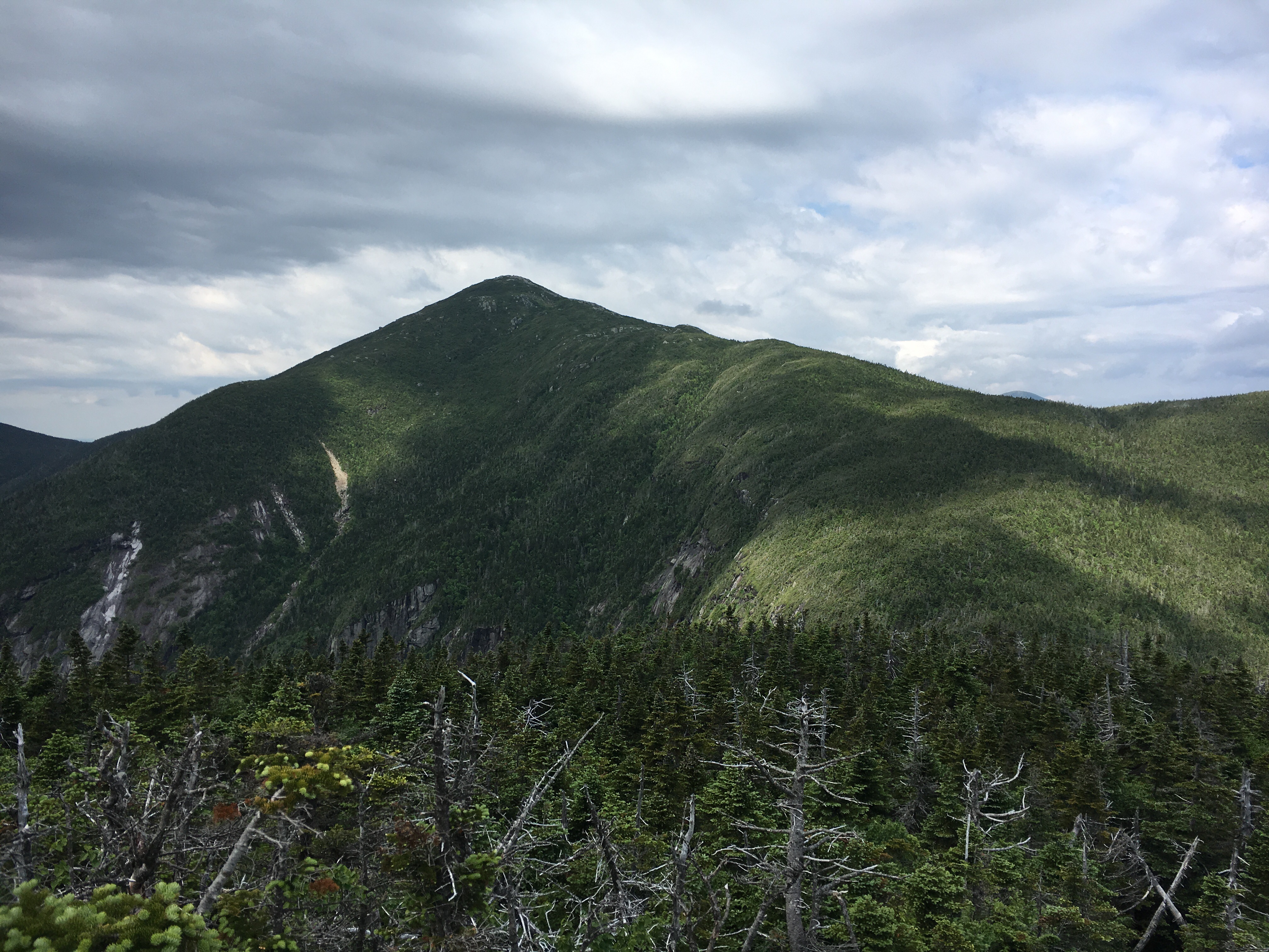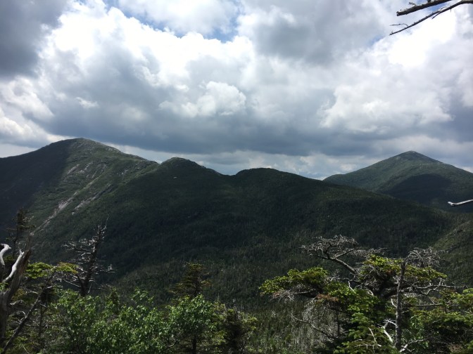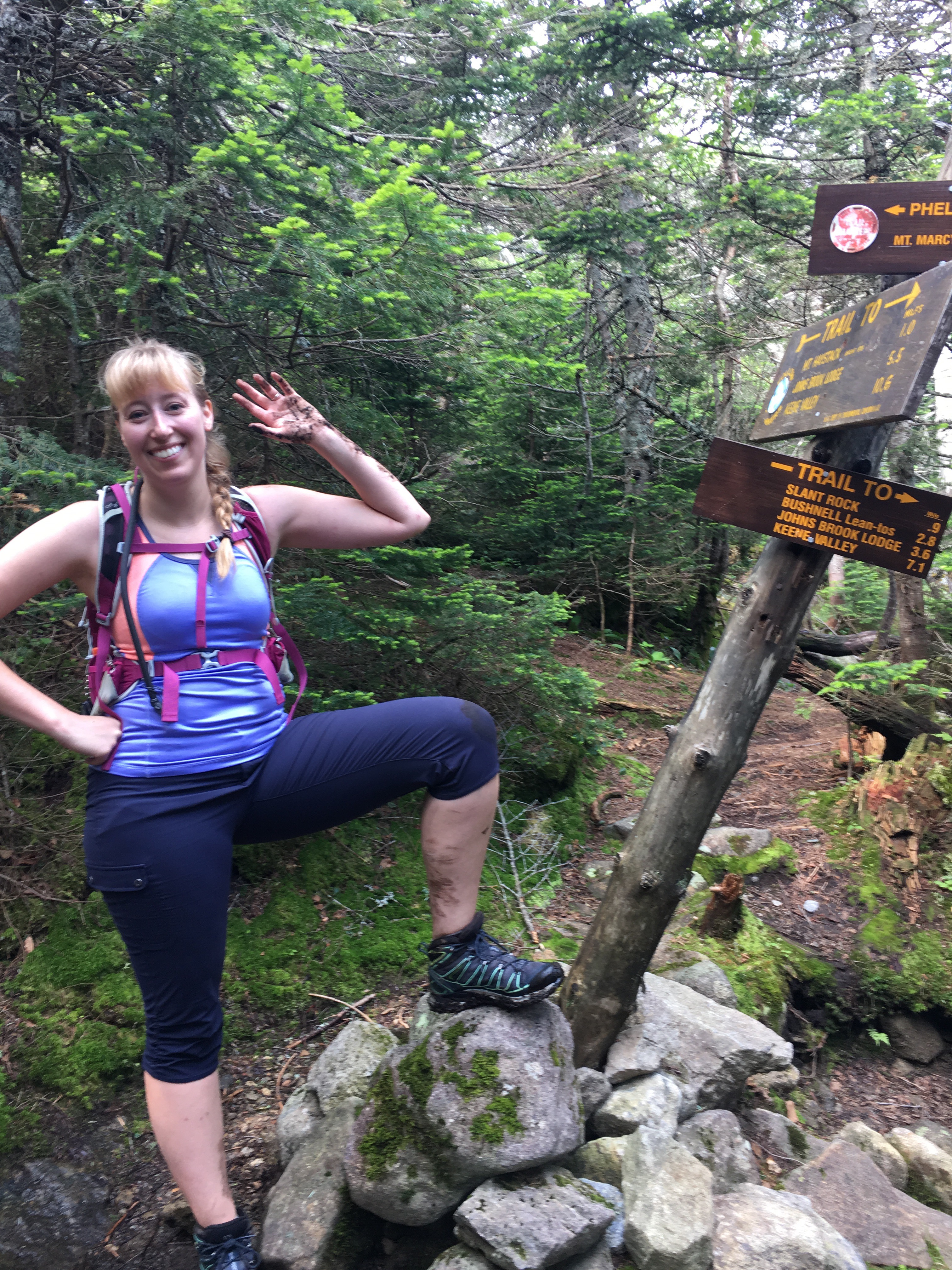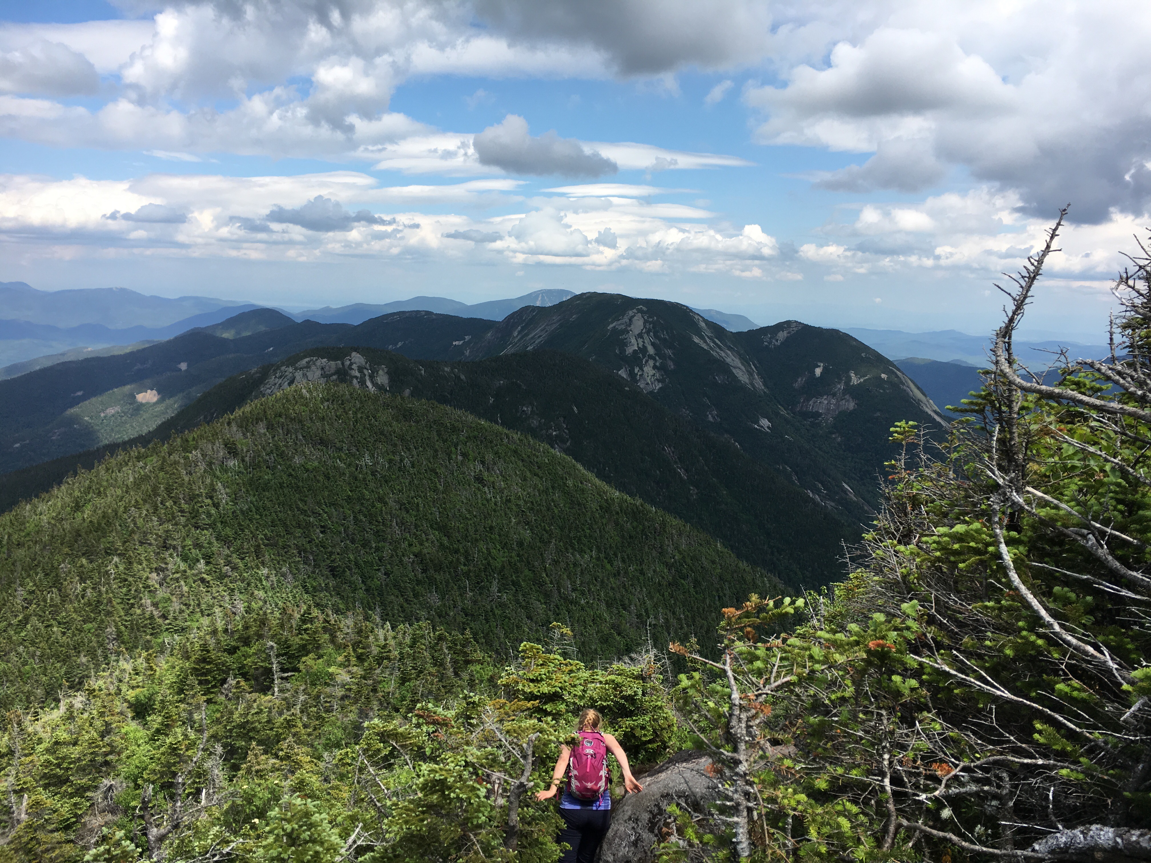 After our 10 minute refueling, the excitement began to build as we left the nub and marched our way over to Little Haystack. Ok…Little Haystack. The views from the summit were incredible! Ascending was relatively simple, following the cairns and the right angle yellow blazes…some footing challenges for the short girl here, but nothing scary. An ominous cloud system appeared to be tailing us, with strong wind gusts from time to time. You know, typical Adirondack summer weather 🙂