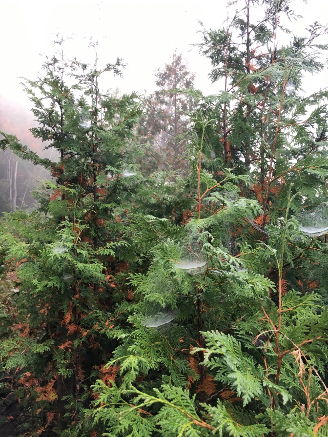 Eerily, dangled webs filled the evergreen section of the trail with pure awesomeness.