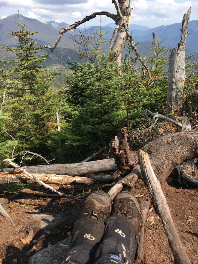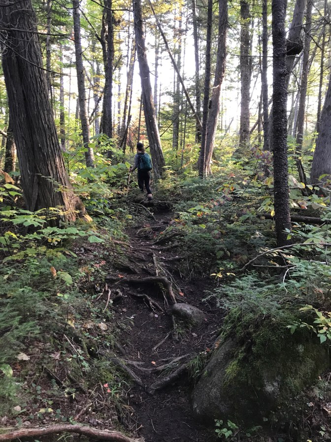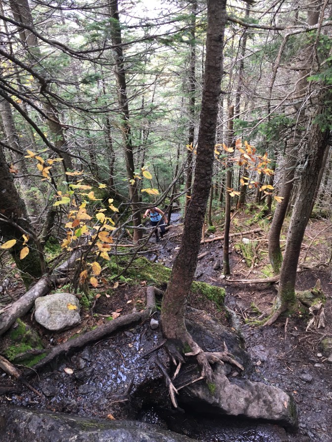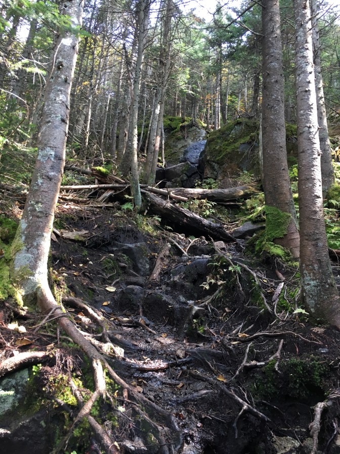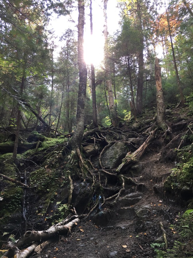 The level ground ended. Enter the slow incline section of hiking in the Adirondacks…through giant roots, crawling under blowdowns, tromping among mud pits nestled between the larger rocks. UP and OVER…OVER and UP.