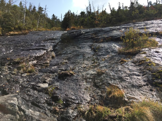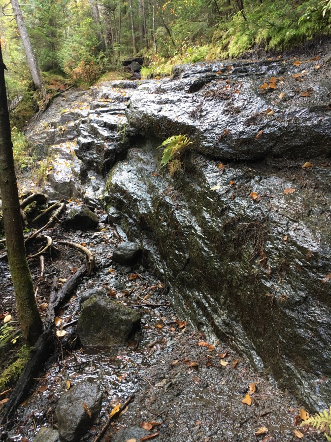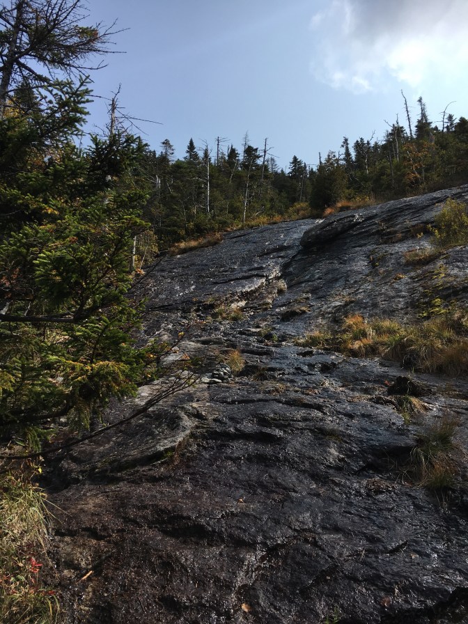Slowly making our way up slide after slide after slide. We still have yet to encounter the red slime. I was beginning to wonder if we would even notice it, quite honestly. This past summer/fall had been the wettest, muddiest that I’ve seen in a long time. Most of my hikes were mud-ridden and slippery. So the red slime didn’t stand out much. Certainly not enough to wear spikes on it as some do.
