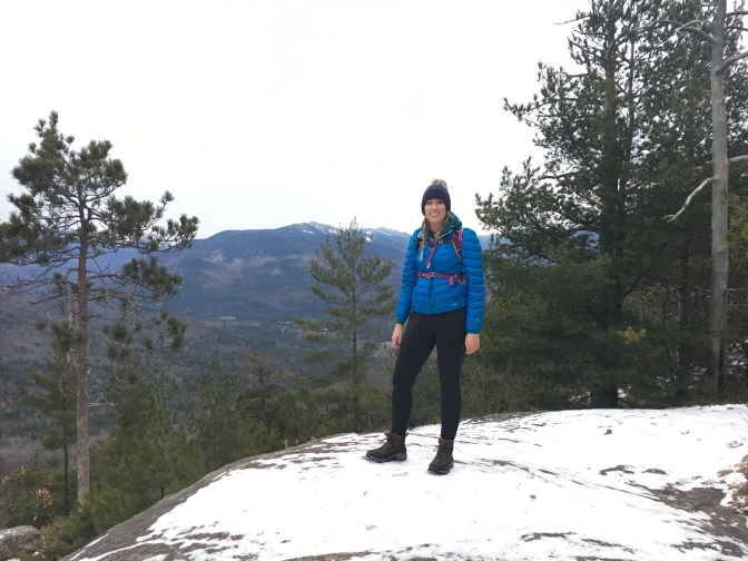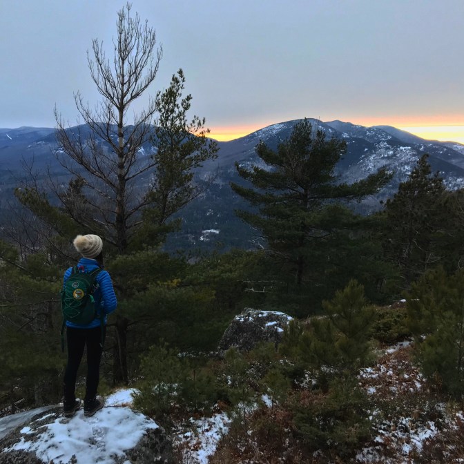 My absolute favorite shot of Mallory with the fading sunset…the woods had grown dark within minutes. And while we didn’t have the open summit to view this stunning close to the day, the vibrancy could be inhaled with just a tiny bushwhack off to the west. At 4:25 p.m. the sun bid us its last farewell as the blueish glow of dusk guided our way into the darkness.