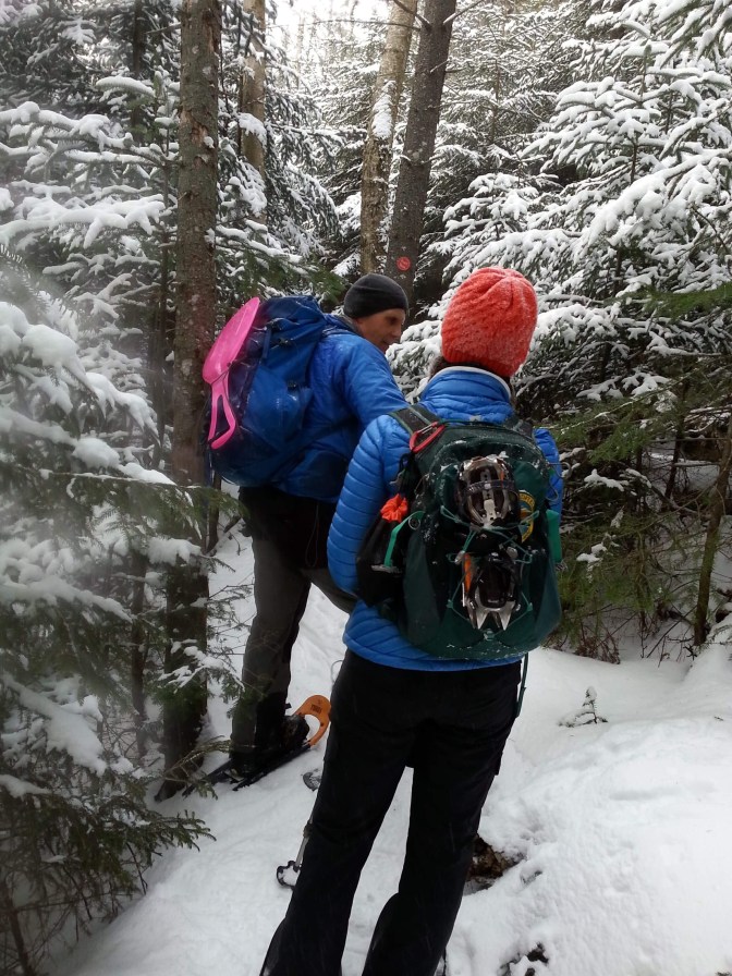 Once we hit the cut-off trail, the snowshoes went on and the lead balloon feeling in the old legs dissipated, thank goodness. My nerves settled somewhat…being worried I wouldn’t be able to keep up. Which would have been ok, but Elk Pass has kicked my a$$ in the past, and I wondered if my mind would put up its own battle with me if I had to climb it alone.