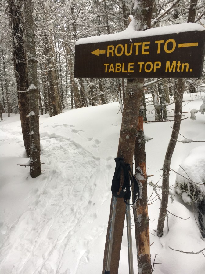 At 10:40 a.m., the junction for Table Top Mountain appeared! The perfect time to take a quick hot chocolate break, relieved that the trail was already broken out!