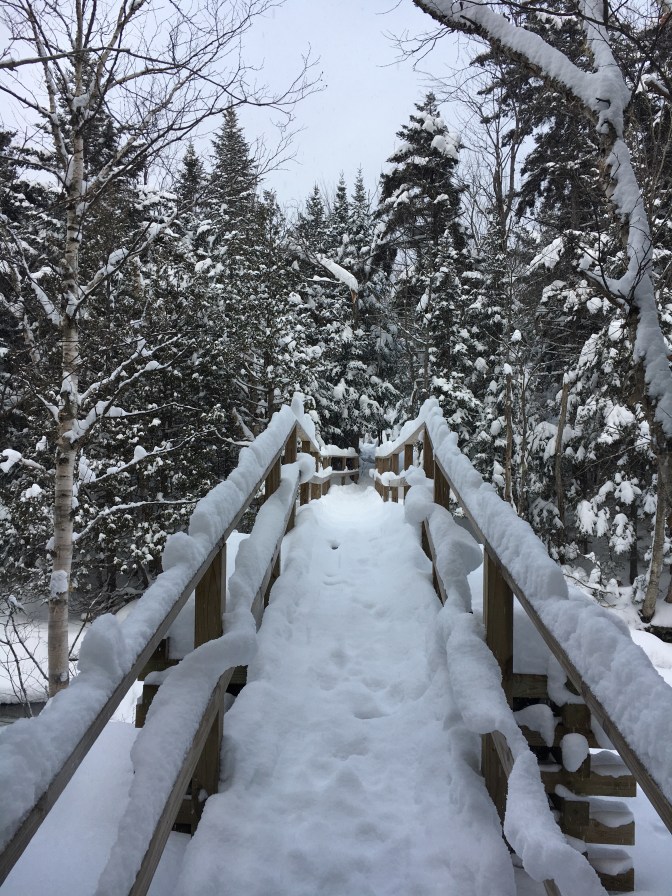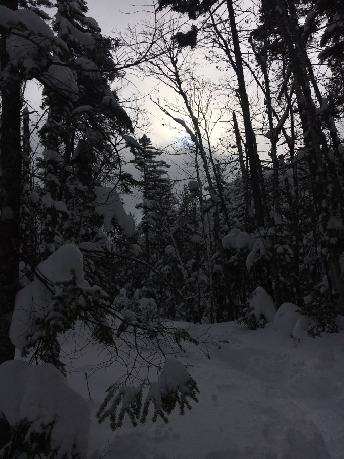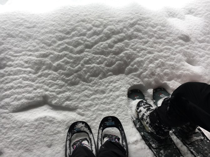 A wall of snow surrounded us in front of the lean-to, probably 3 feet high! I attempted to capture it in relation to our snowshoes. Well I tried. It was a relief to sit for a few minutes. I needed to readjust my boots and snowshoes too. We didn’t linger too long, though as the cold chilled my bones.