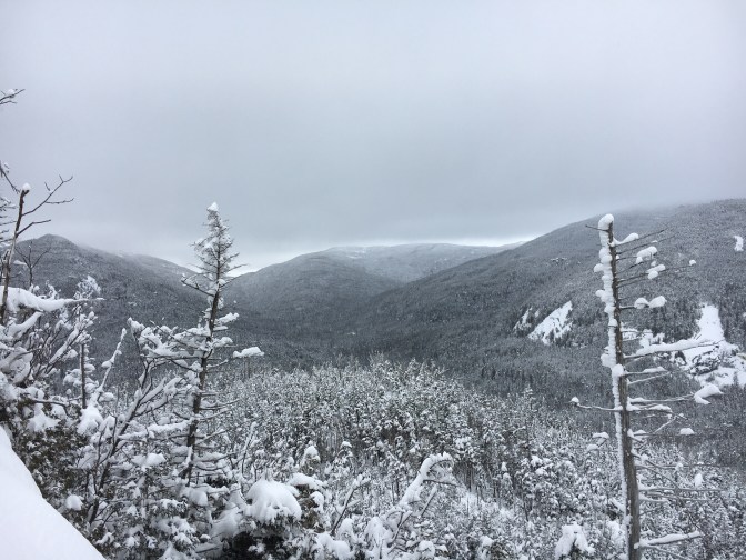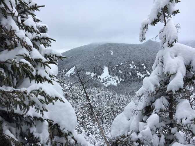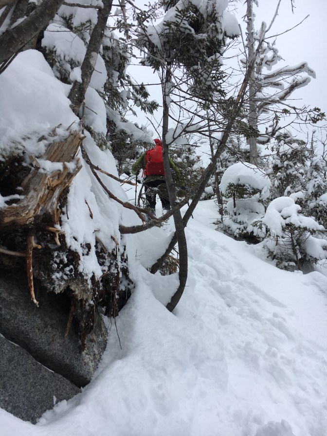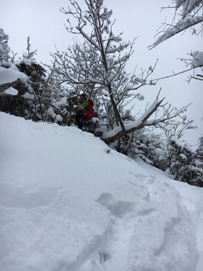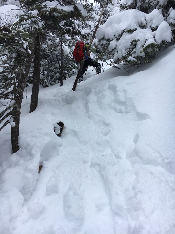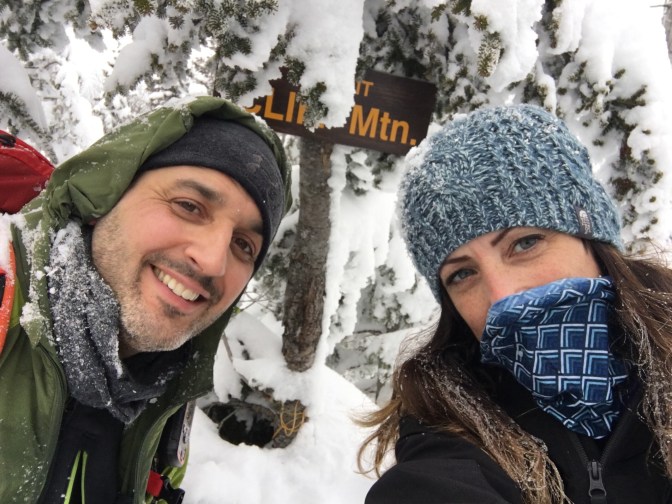 Sean’s busted snowshoe was causing some slick moments. I, on the other hand, had no problem climbing up Cliff. 😉 In all fairness, I dropped my pack for this mountain too.