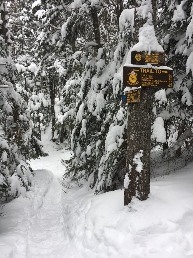 It took 15 minutes to walk across Avalanche Lake. Then a few minutes through the trail to get to Lake Colden. We met the caretaker for Warden’s Camp for the weekend, as she skied across. The sweetest lady!! When we told her we were heading to Redfield and Cliff, she replied with positive, encouraging words. “You’ll have a great day up there!”
