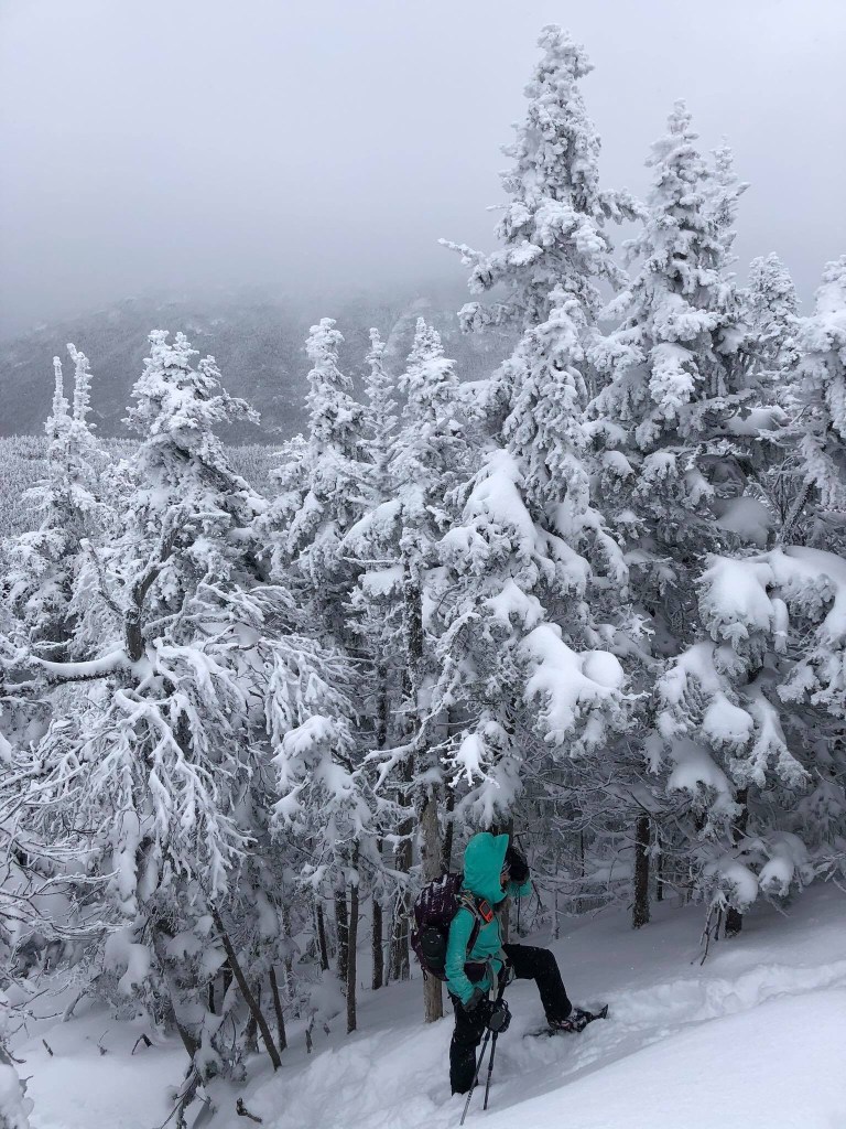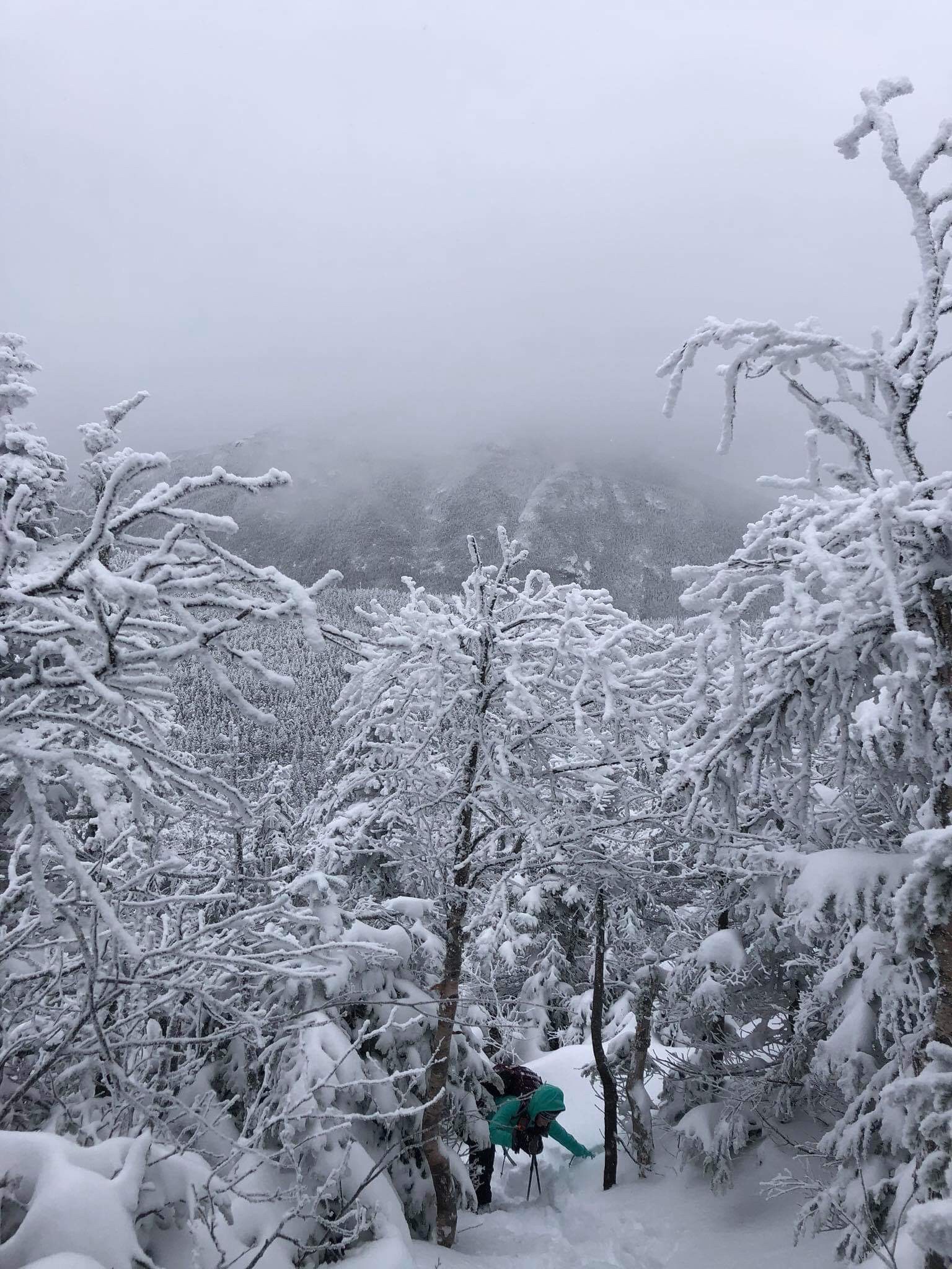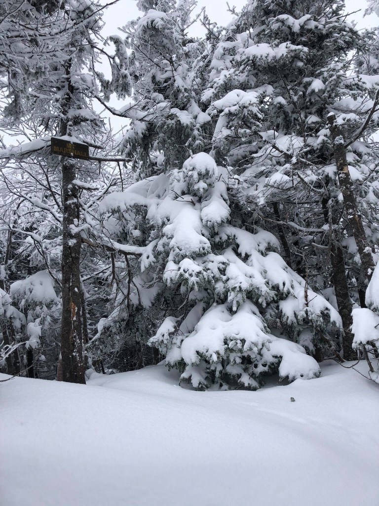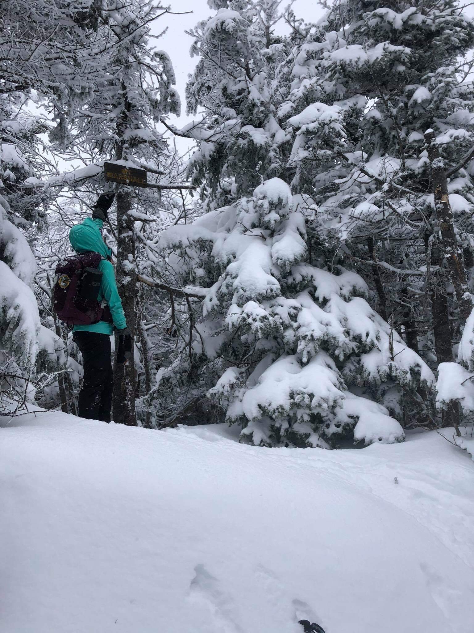 “Alli…it’s not broken out.” I said half defeated, half shocked. There was a good 8 inches or so at the base of the path. My PTSD started kicking in from last winter’s attempt. We spent hours trying to make it to the summit through thigh deep snow then, losing the trail towards the higher elevation. Now, here we were again. Less snow to start, but still with the issue of trail finding on one of the most difficult mountains to hike in the winter for precisely that reason!