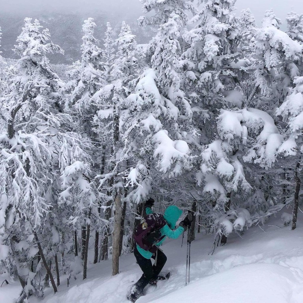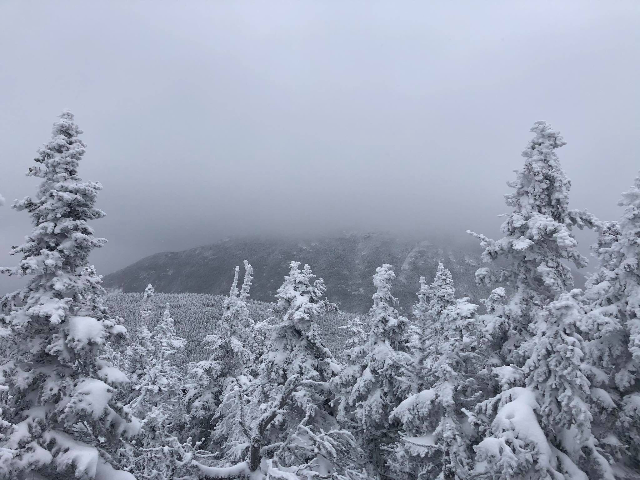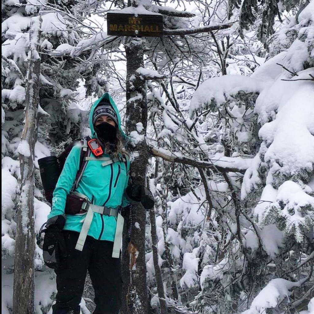 “Alli…it’s not broken out.” I said half defeated, half shocked. There was a good 8 inches or so at the base of the path. My PTSD started kicking in from last winter’s attempt. We spent hours trying to make it to the summit through thigh deep snow then, losing the trail towards the higher elevation. Now, here we were again. Less snow to start, but still with the issue of trail finding on one of the most difficult mountains to hike in the winter for precisely that reason!