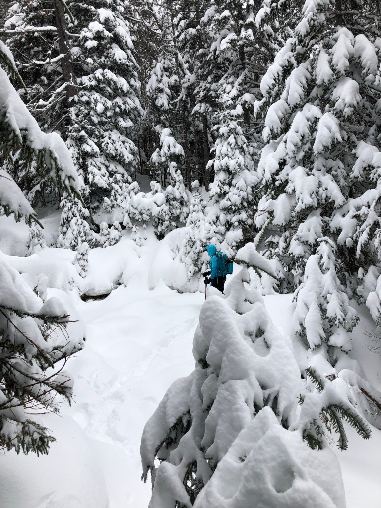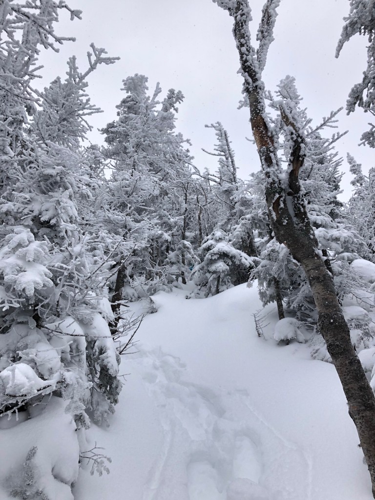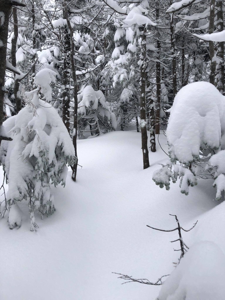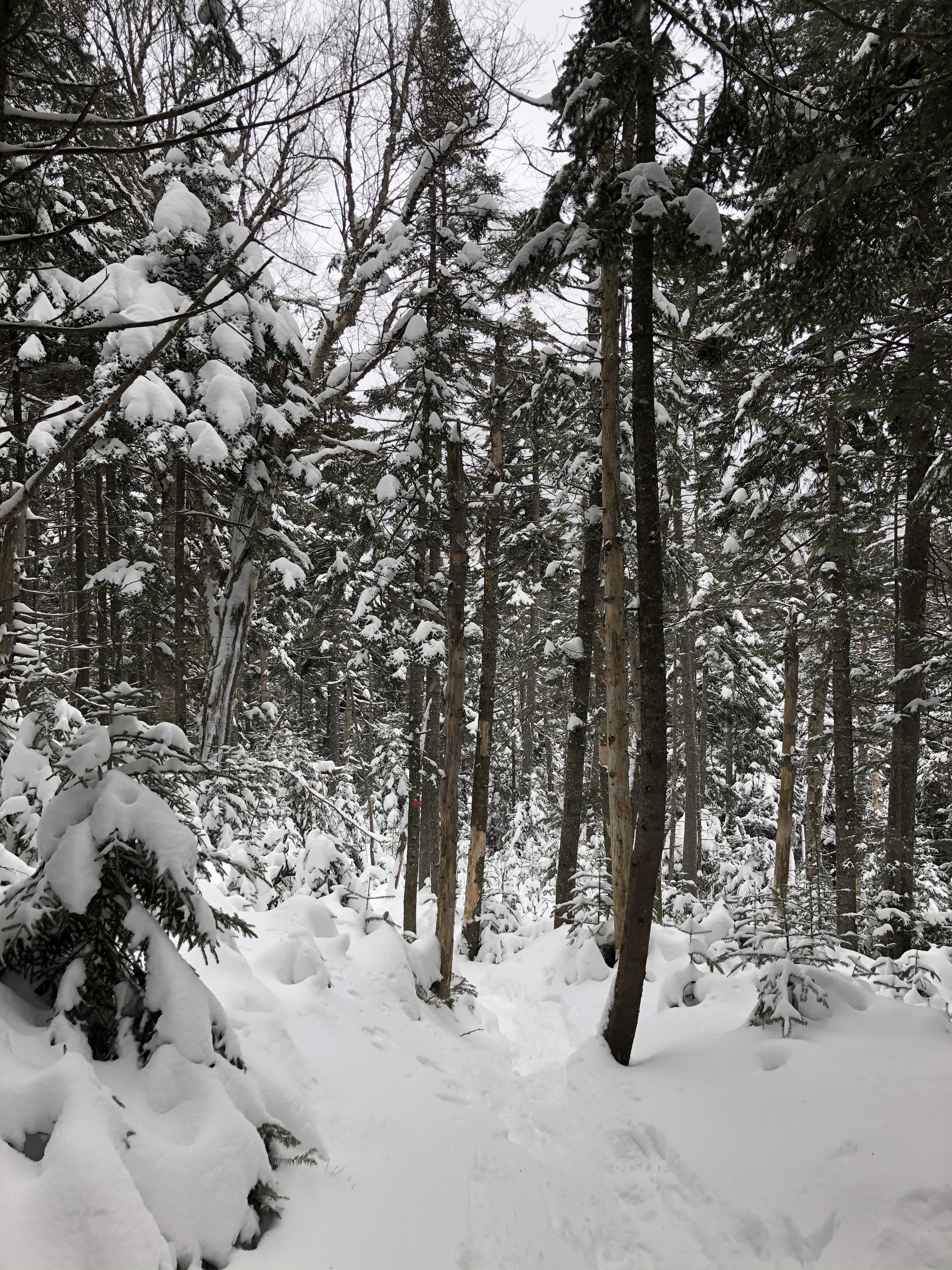Now that trail…the usual one that follows along and around the Flowed Lands…that trail is not flat. I remembered the section all too well. You lose elevation and then gain, then lose, then climb steeply up to the herdpath. Slow on the up, fast on the out. That’s how I roll. Also, my “roll” caused me to lose sight of Allison again, haha. However, the hike to the Herbert Brook herdpath was quite lovely to admire. Slender snow-covered pines, huddled so closely together as to create a meandering path leading the way.