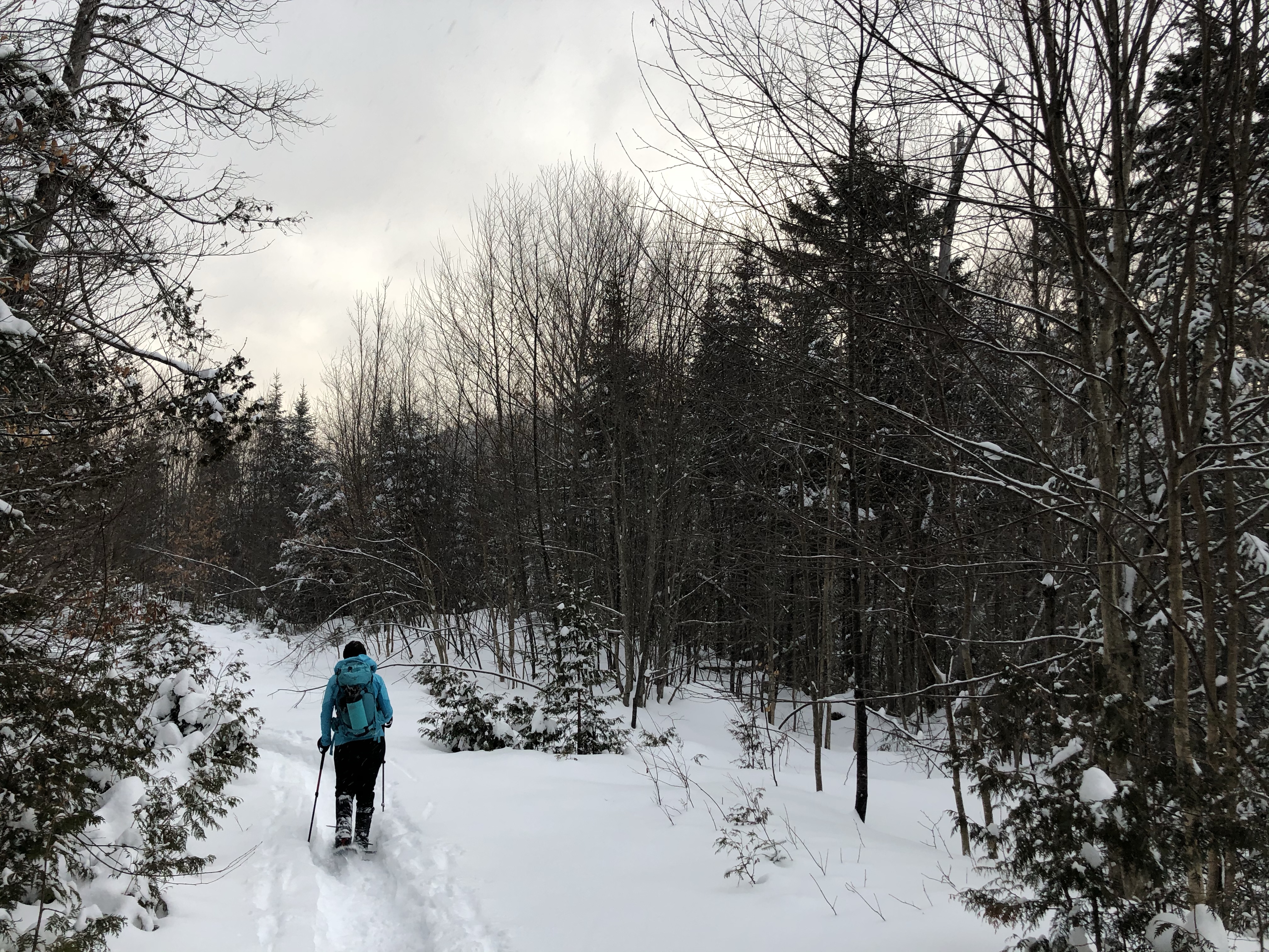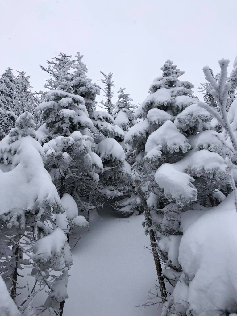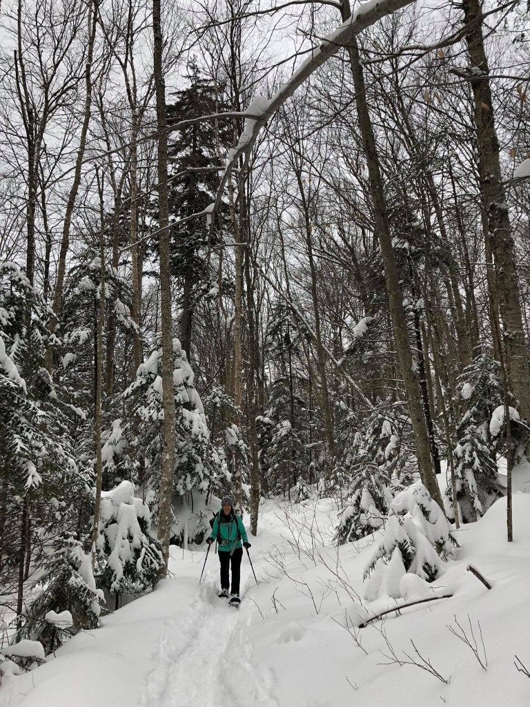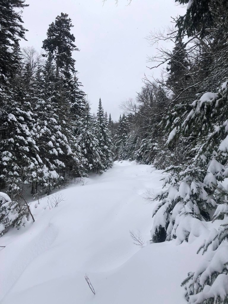 Now that trail…the usual one that follows along and around the Flowed Lands…that trail is not flat. I remembered the section all too well. You lose elevation and then gain, then lose, then climb steeply up to the herdpath. Slow on the up, fast on the out. That’s how I roll. Also, my “roll” caused me to lose sight of Allison again, haha. However, the hike to the Herbert Brook herdpath was quite lovely to admire. Slender snow-covered pines, huddled so closely together as to create a meandering path leading the way.