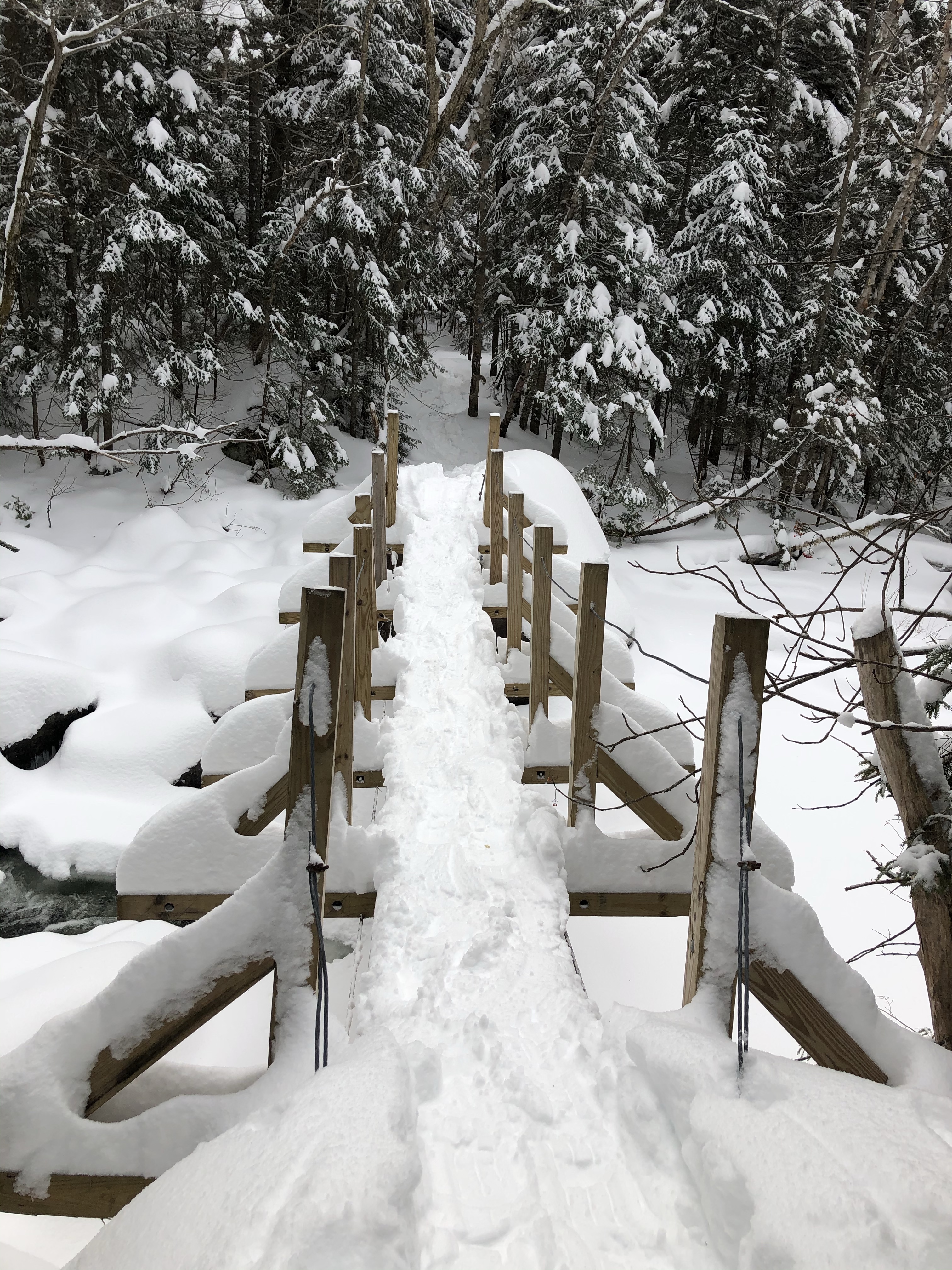 The slides, an easy summer route, currently coated in nature’s fluffy precipitation. We crossed the brook a few more times.