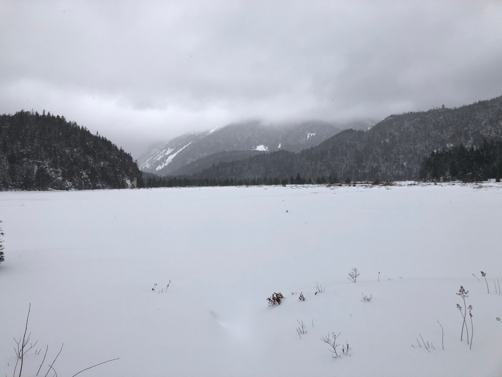 After our munchies and bone broth, the discussion began about whether or not to cross the Flowed Lands. It would save some time and elevation gain/loss…but the whipping wind was blustery! As I pointed out Mount Colden in the clouds, the other group of 4 showed up. They had taken a break at the lean-to. After chatting for a bit, the team of 4, who were heading to Cliff, ventured across the frozen H2O, while Alli and I decided to following the tracks on the main trail. We figured we could return across it instead.