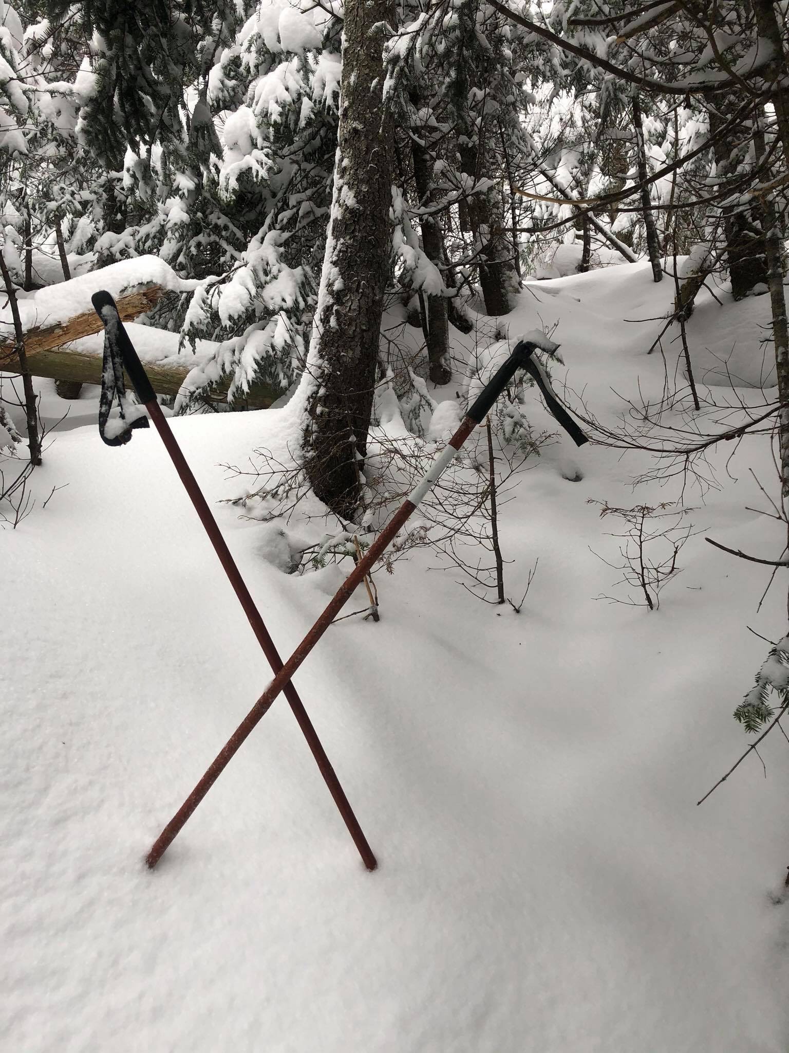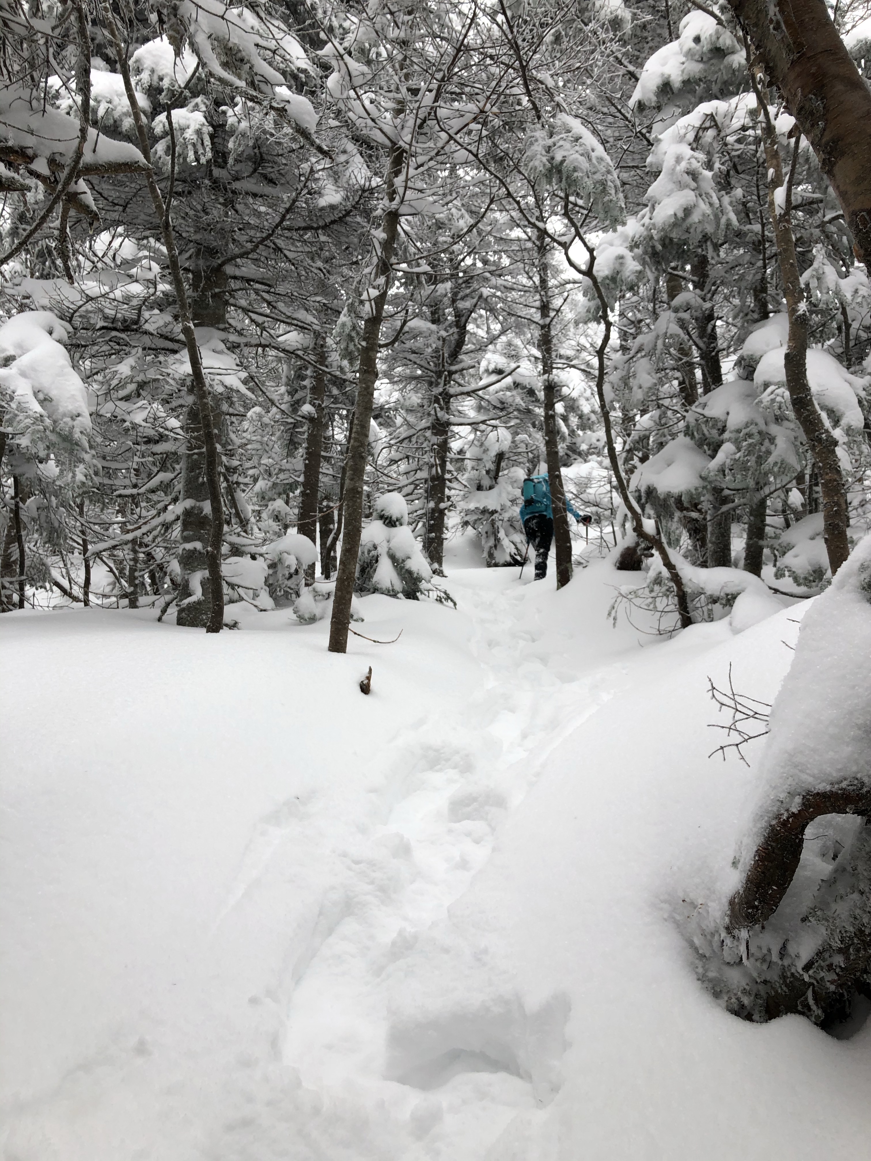 We hit a slight bump in the road when the path led us back to the right of the brook. There appeared to be significant blowdown blocking the path. We stopped to check my track on my InReach to see if it could help. It did and did not. Straight ahead was, in fact, the trail. We were right on it. However after a few attempts of finding a way around the trail, we agreed that we must have to cross the brook...again. Non-conventional, but it was the only way. THIS must have been the tricky water crossing that previous hikers warned about. As long as we were able to cross back over the brook, all would be well. In the winter, it is imperative to stay to the right of Herbert Brook as much as possible…especially toward the height of the brook.