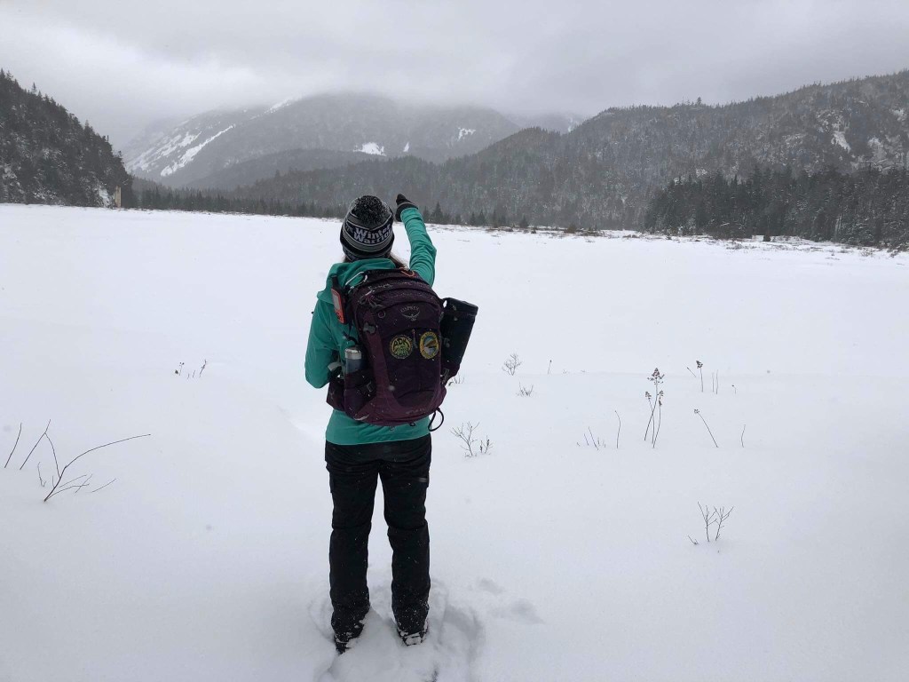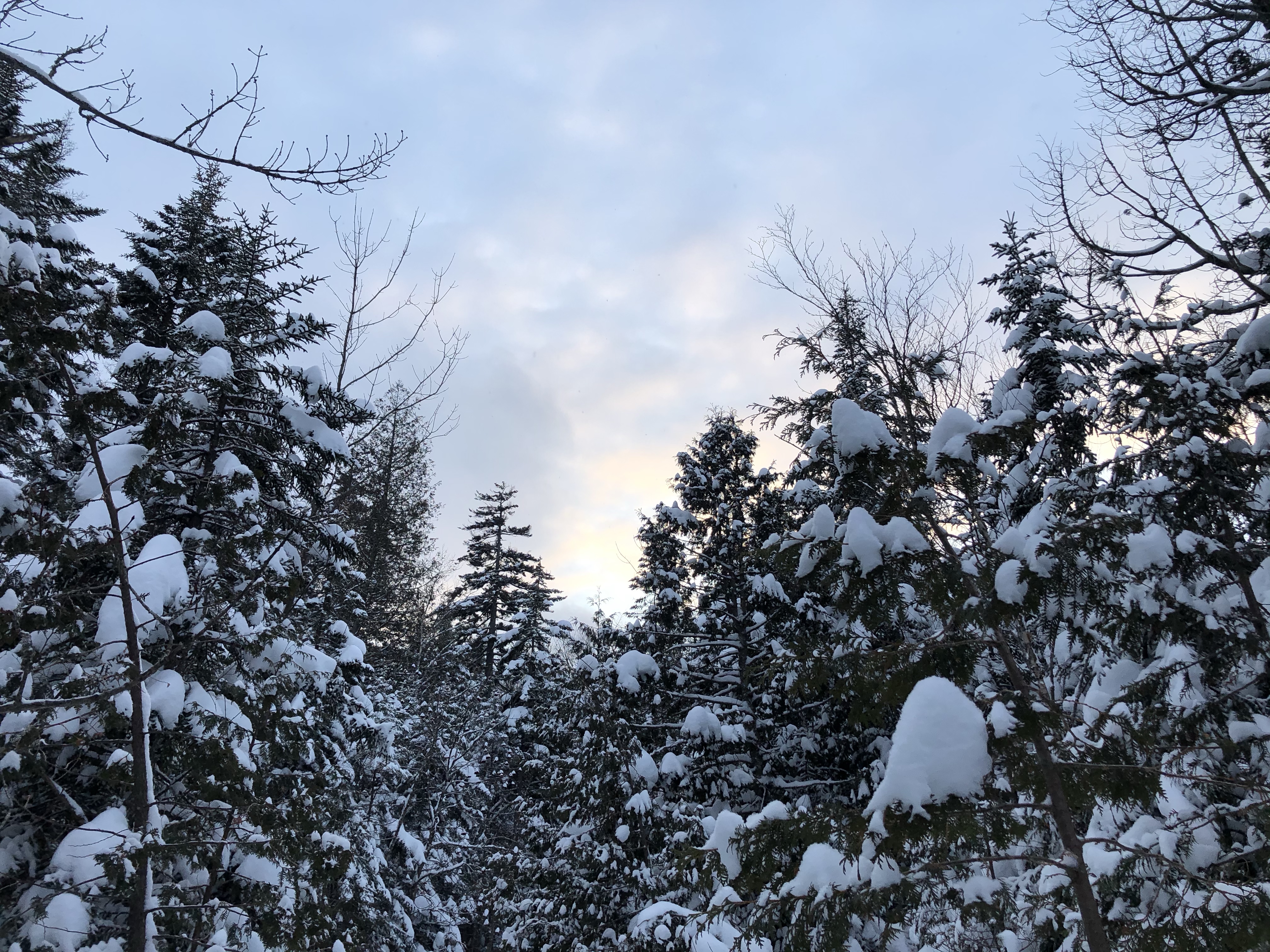 Keeping a steady pace, our snowshoes didn’t rest until we reached the bridge. It was still light out! We were graced with a few moments of blue skies and pink clouds at 4:30 p.m. The Universe graced us twice today…one for sunrise and now for sunset.